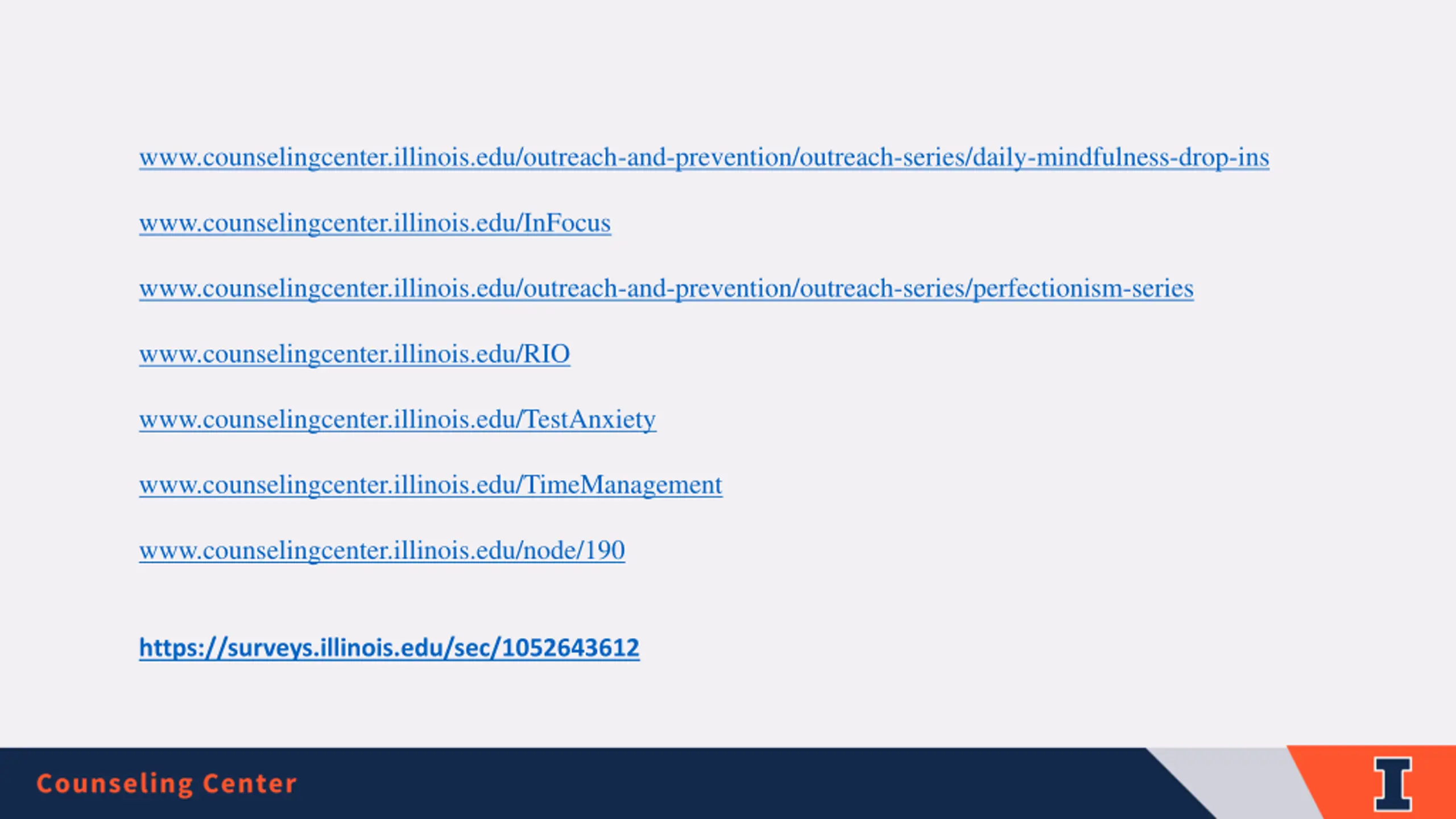 www.counselingcenter.illinois.edu/outreach-and-prevention/outreach-series/daily-mindfulness-drop-inswww.counselingcenter.illinois.edu/outreach-and-prevention/outreach-series/daily-mindfulness-drop-ins www.counselingcenter.illinois.edu/InFocus www.counselingcenter.illinois.edu/outreach-and-prevention/outreach-series/perfectionism-series www.counselingcenter.illinois.edu/RIO www.counselingcenter.illinois.edu/TestAnxiety www.counselingcenter.illinois.edu/TimeManagement www.counselingcenter.illinois.edu/node/190 https://surveys.illinois.edu/sec/1052643612