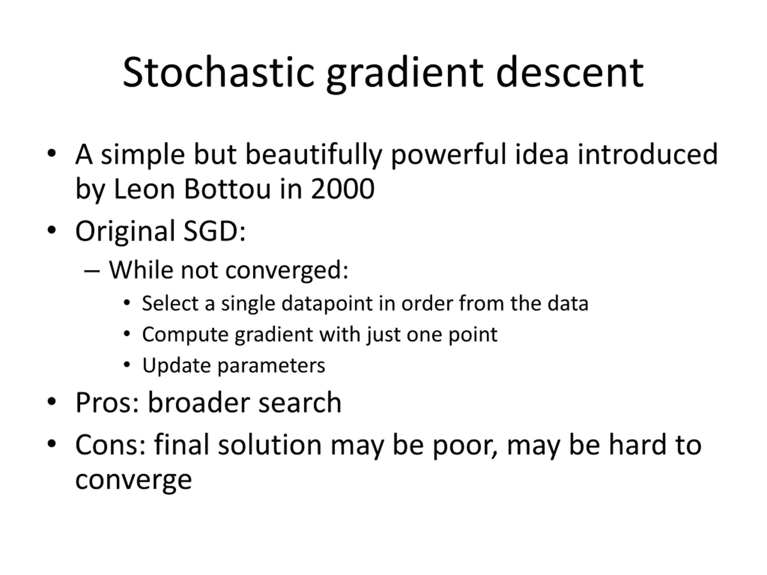 Stochastic gradient descent A simple but beautifully powerful idea introduced by Leon Bottou in 2000 Original SGD: While not converged: Select a single datapoint in order from the data Compute gradient with just one point Update parameters Pros: broader search Cons: final solution may be poor, may be hard to converge