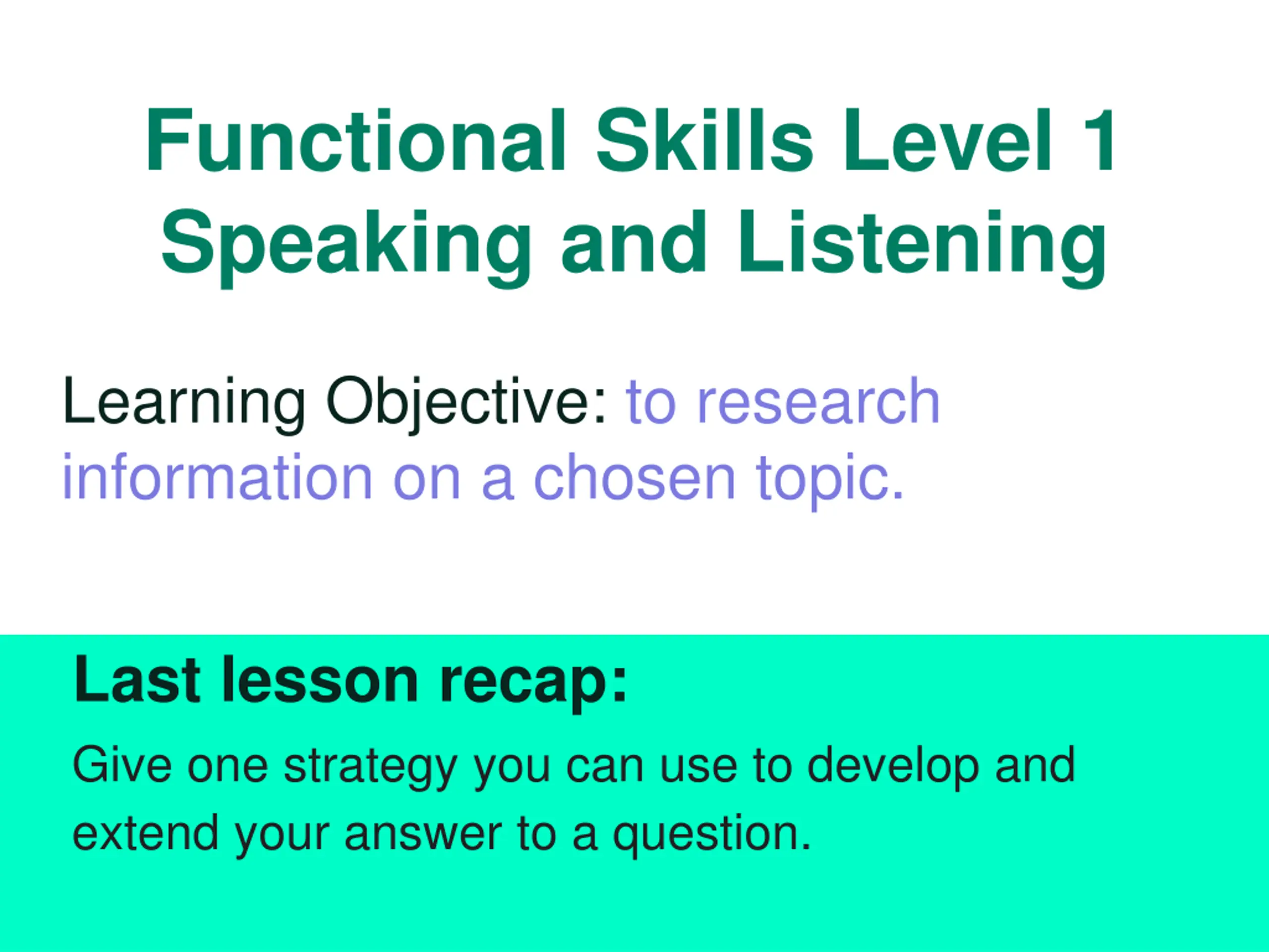 Functional Skills Level 1 Speaking and Listening Learning Objective: to research information on a chosen topic. Last lesson recap: Give one strategy you can use to develop and extend your answer to a question.