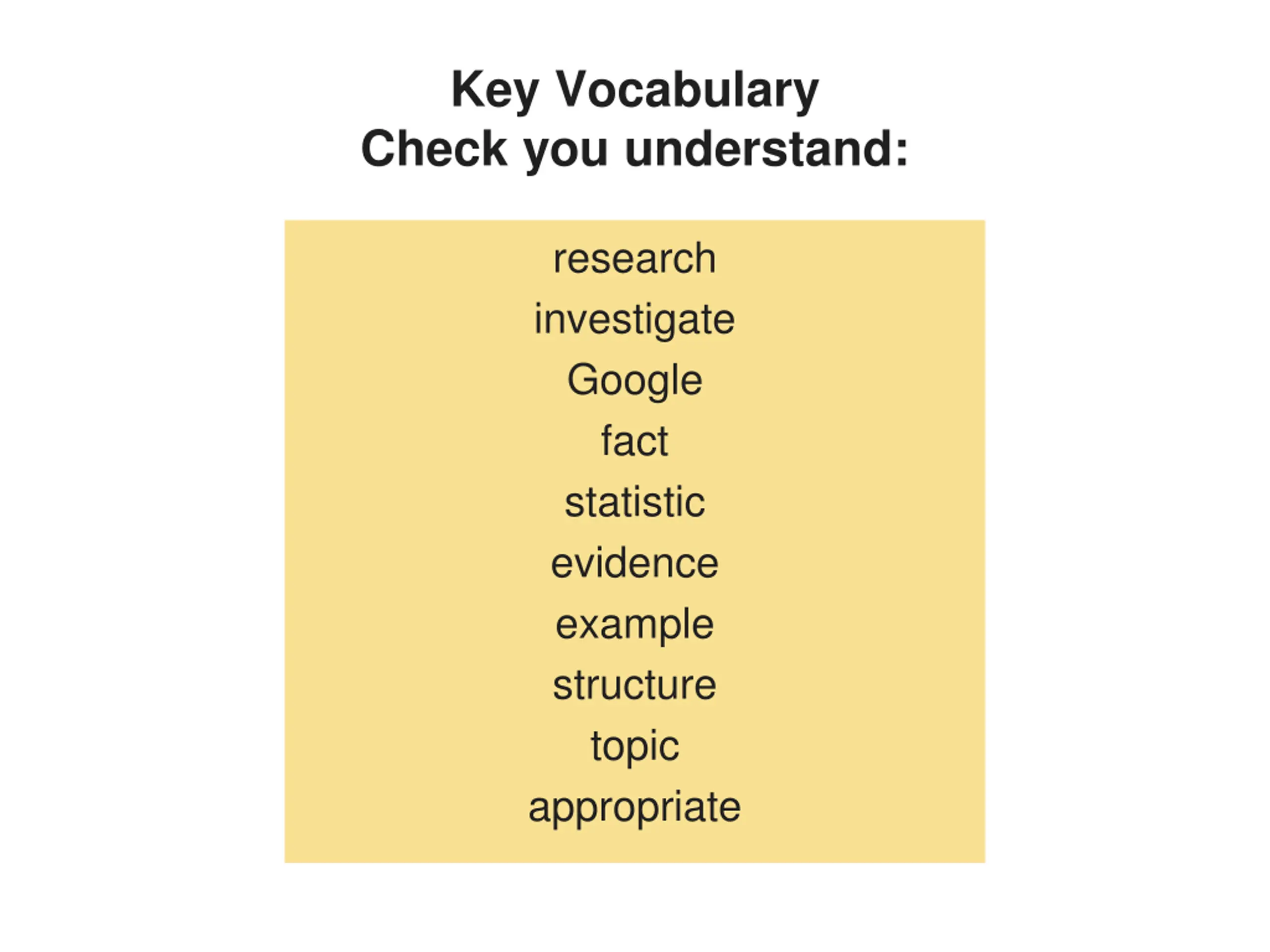 Key Vocabulary Check you understand: research investigate Google fact statistic evidence example structure topic appropriate