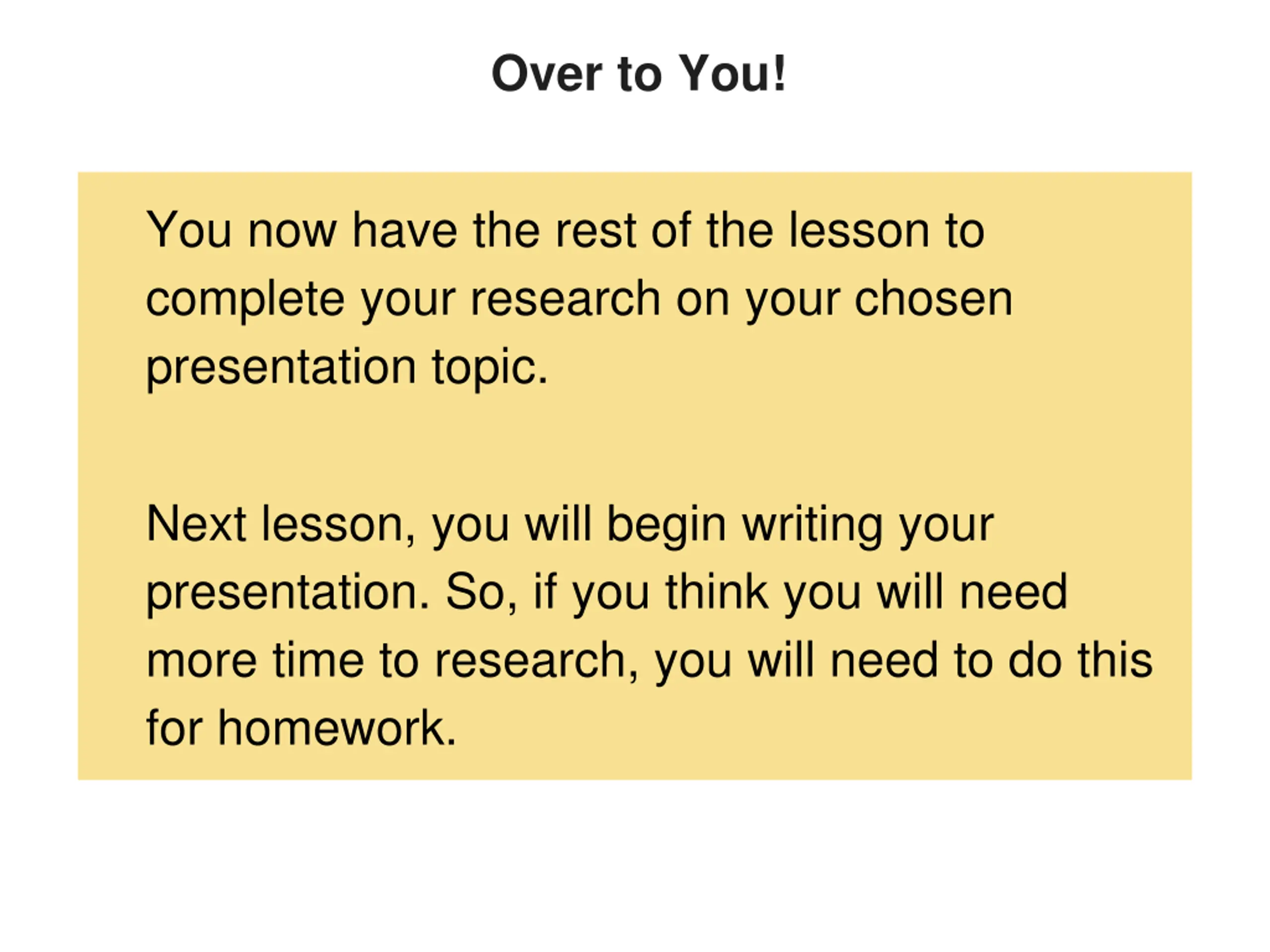 Over to You! You now have the rest of the lesson to complete your research on your chosen presentation topic. Next lesson, you will begin writing your presentation. So, if you think you will need more time to research, you will need to do this for homework.