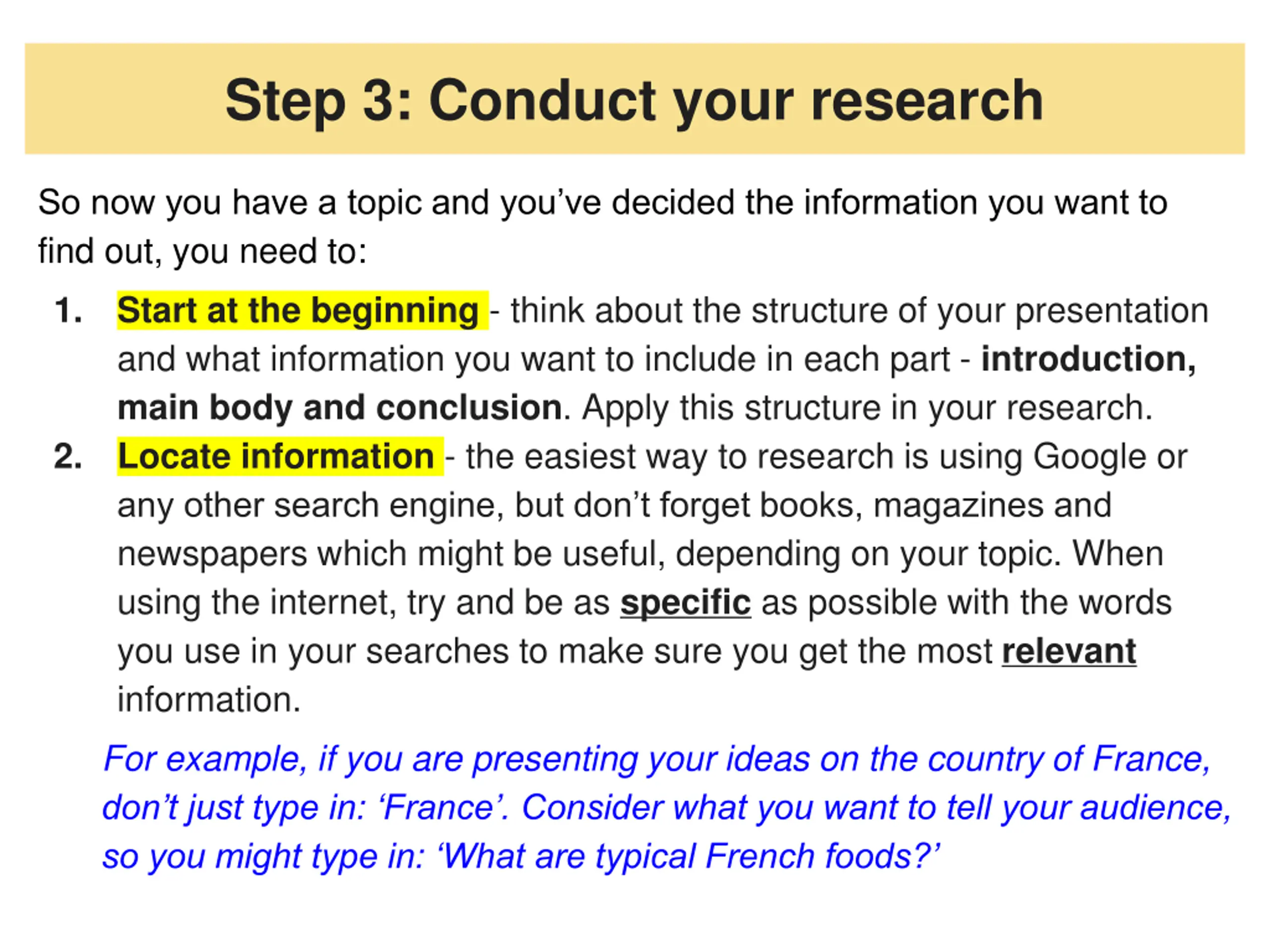 Step 3: Conduct your research So now you have a topic and you ve decided the information you want to find out, you need to: Start at the beginning - think about the structure of your presentation and what information you want to include in each part - introduction, main body and conclusion. Apply this structure in your research. Locate information - the easiest way to research is using Google or any other search engine, but don t forget books, magazines and newspapers which might be useful, depending on your topic. When using the internet, try and be as specific as possible with the words you use in your searches to make sure you get the most relevant information. 1. 2. For example, if you are presenting your ideas on the country of France, don t just type in: France . Consider what you want to tell your audience, so you might type in: What are typical French foods?