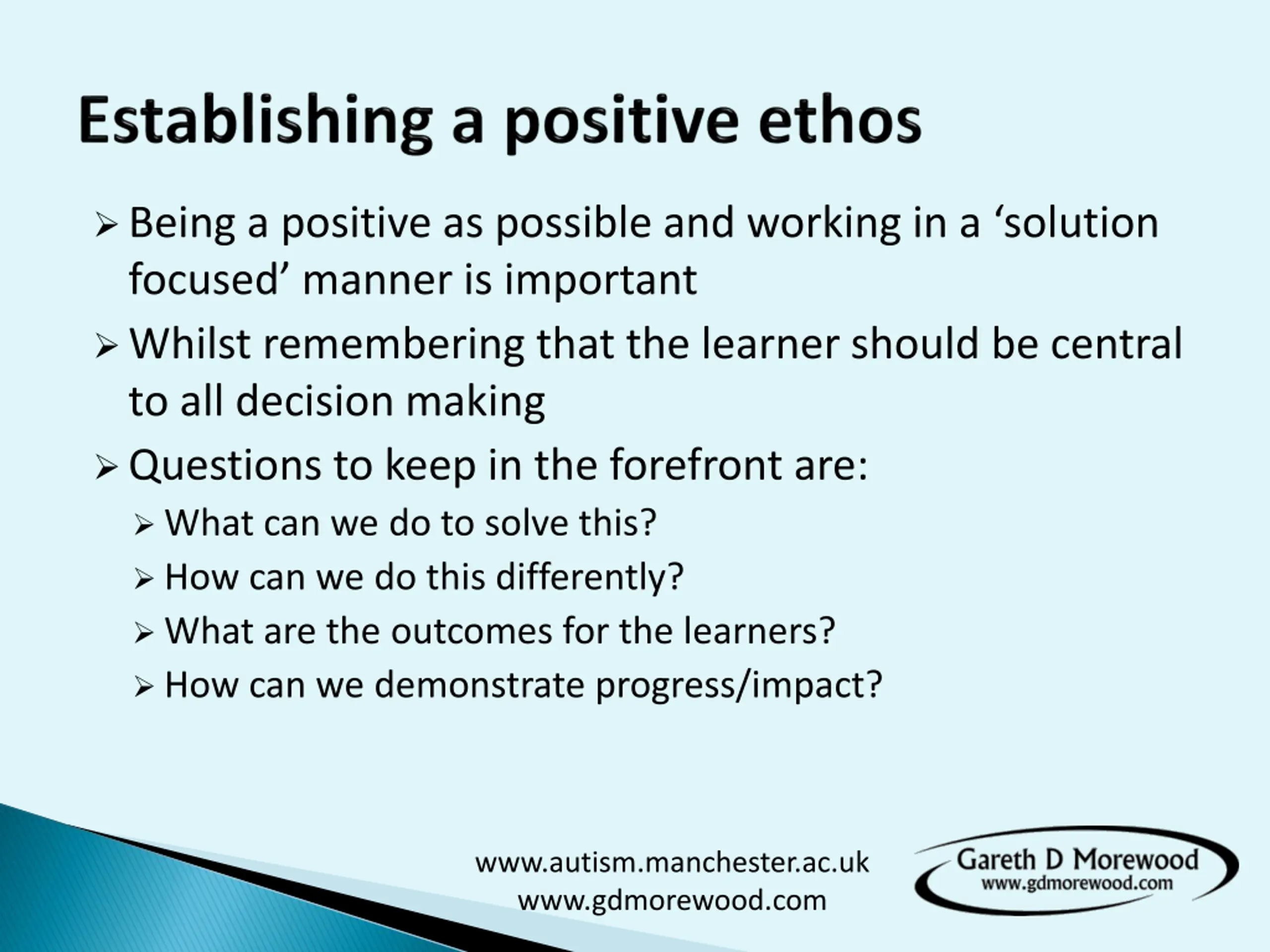 Being a positive as possible and working in a solution focused manner is important Whilst remembering that the learner should be central to all decision making Questions to keep in the forefront are: What can we do to solve this? How can we do this differently? What are the outcomes for the learners? How can we demonstrate progress/impact? www.autism.manchester.ac.uk www.gdmorewood.com