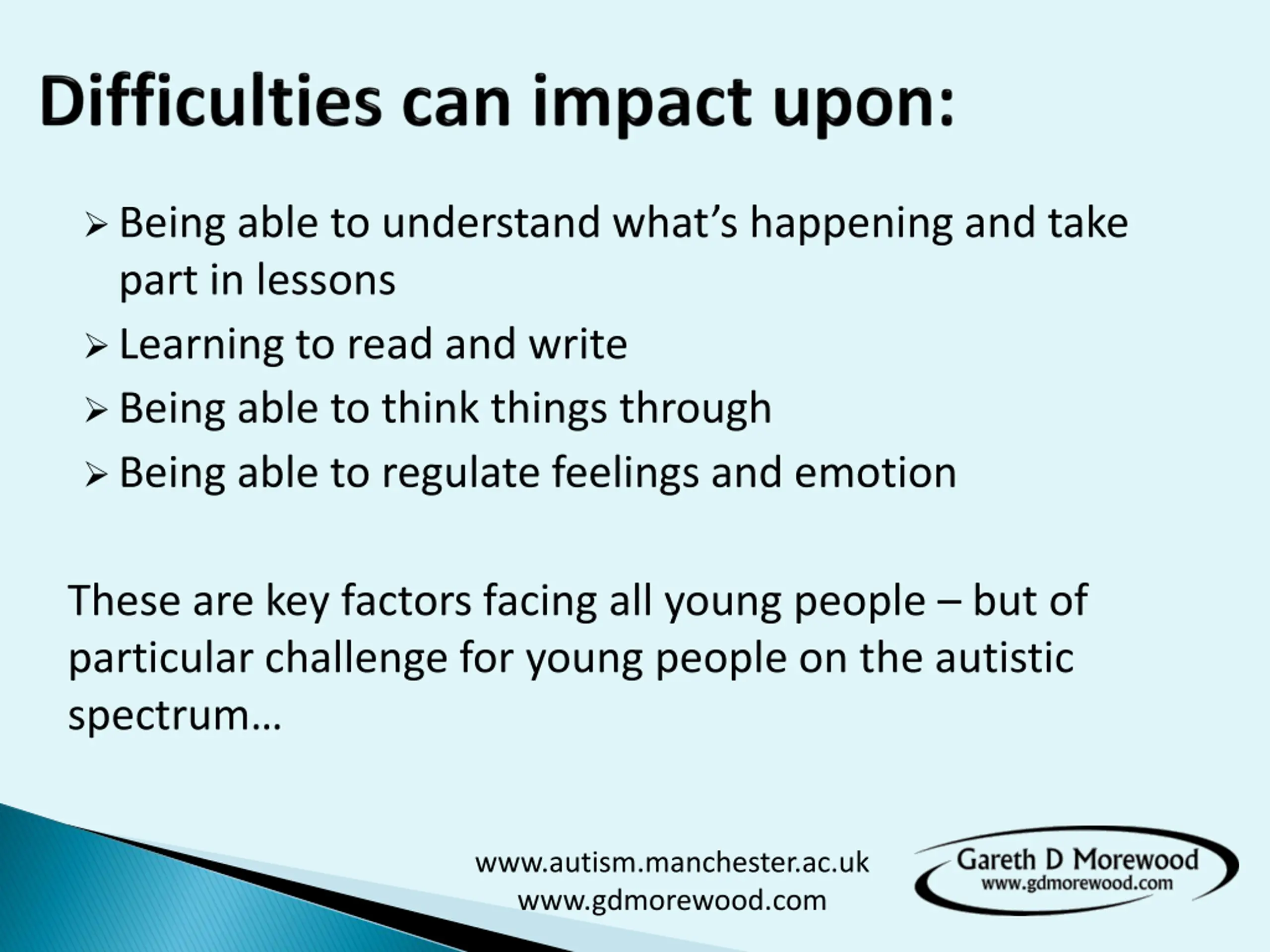 Being able to understand whats happening and take part in lessons Learning to read and write Being able to think things through Being able to regulate feelings and emotion These are key factors facing all young people but of particular challenge for young people on the autistic spectrum www.autism.manchester.ac.uk www.gdmorewood.com