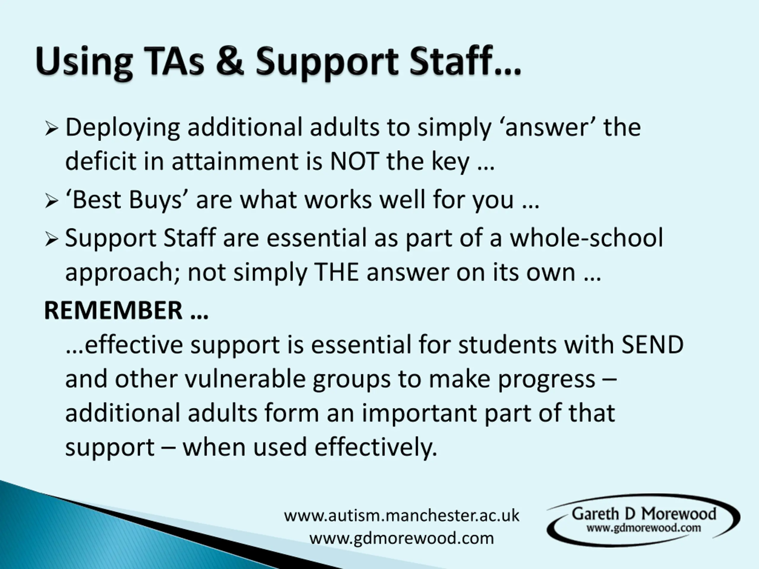 Deploying additional adults to simply answer the deficit in attainment is NOT the key Best Buys are what works well for you Support Staff are essential as part of a whole-school approach; not simply THE answer on its own REMEMBER effective support is essential for students with SEND and other vulnerable groups to make progress additional adults form an important part of that support when used effectively. www.autism.manchester.ac.uk www.gdmorewood.com