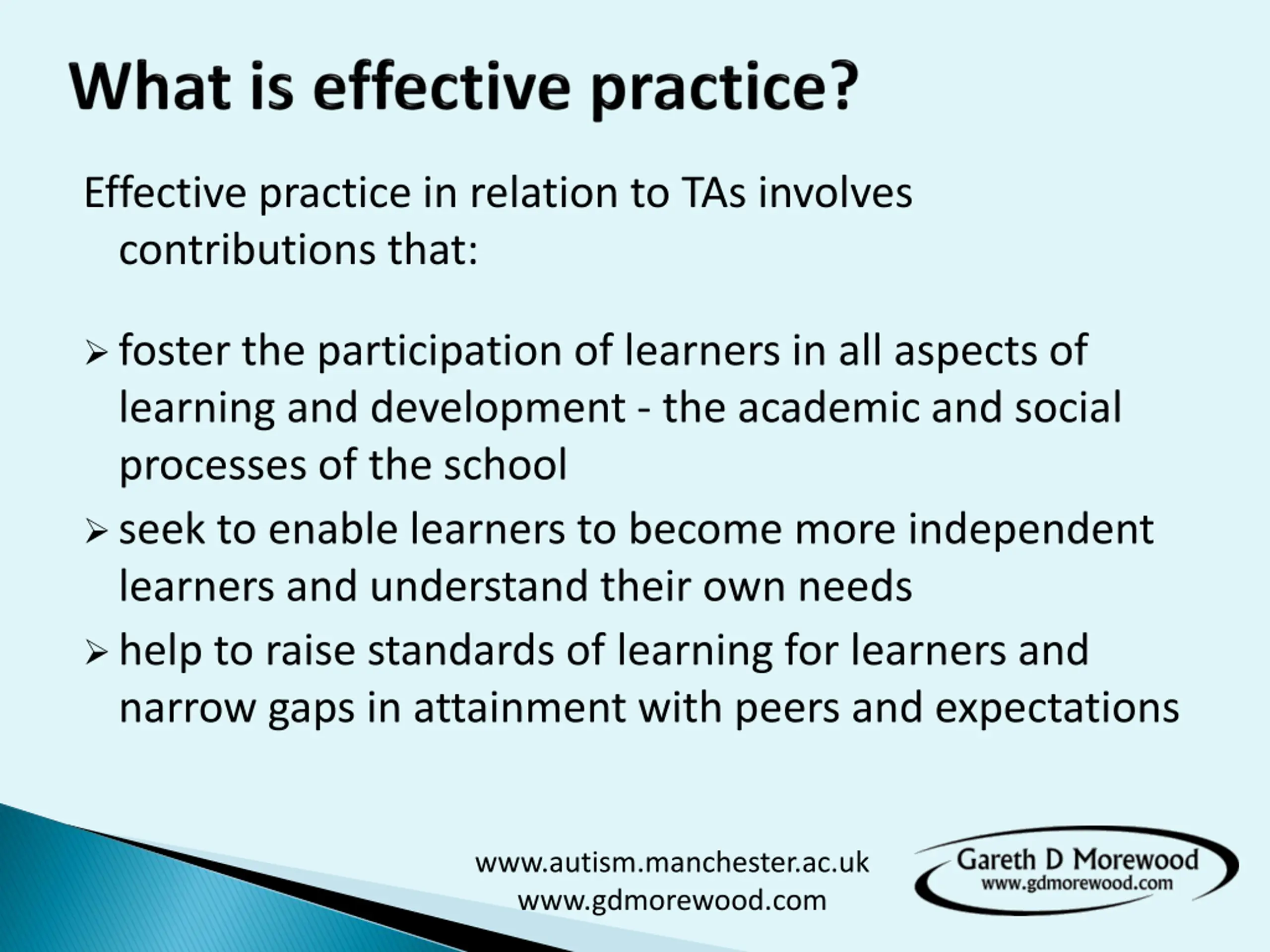 Effective practice in relation to TAs involves contributions that: foster the participation of learners in all aspects of learning and development - the academic and social processes of the school seek to enable learners to become more independent learners and understand their own needs help to raise standards of learning for learners and narrow gaps in attainment with peers and expectations www.autism.manchester.ac.uk www.gdmorewood.com