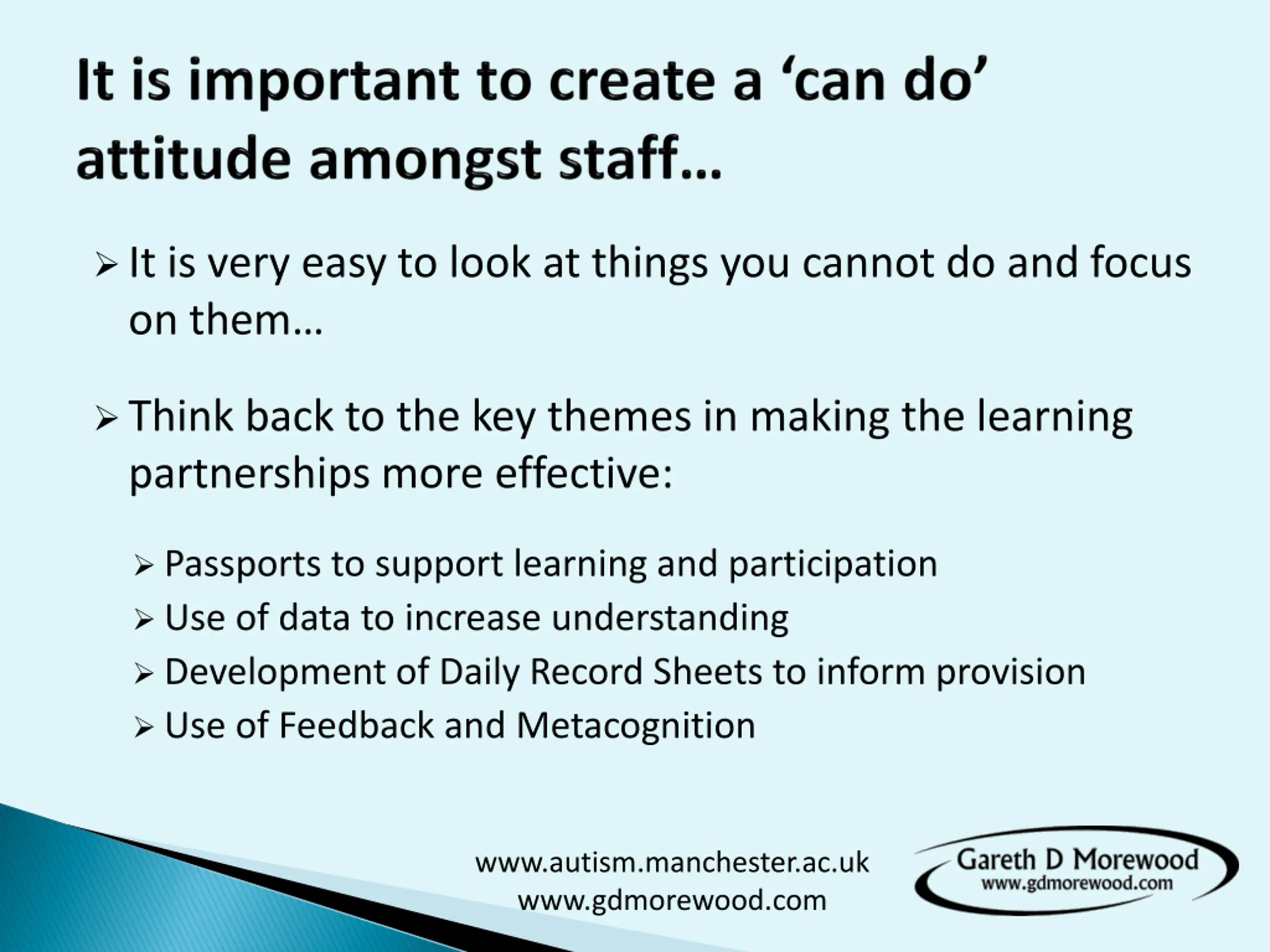 It is very easy to look at things you cannot do and focus on them Think back to the key themes in making the learning partnerships more effective: Passports to support learning and participation Use of data to increase understanding Development of Daily Record Sheets to inform provision Use of Feedback and Metacognition www.autism.manchester.ac.uk www.gdmorewood.com