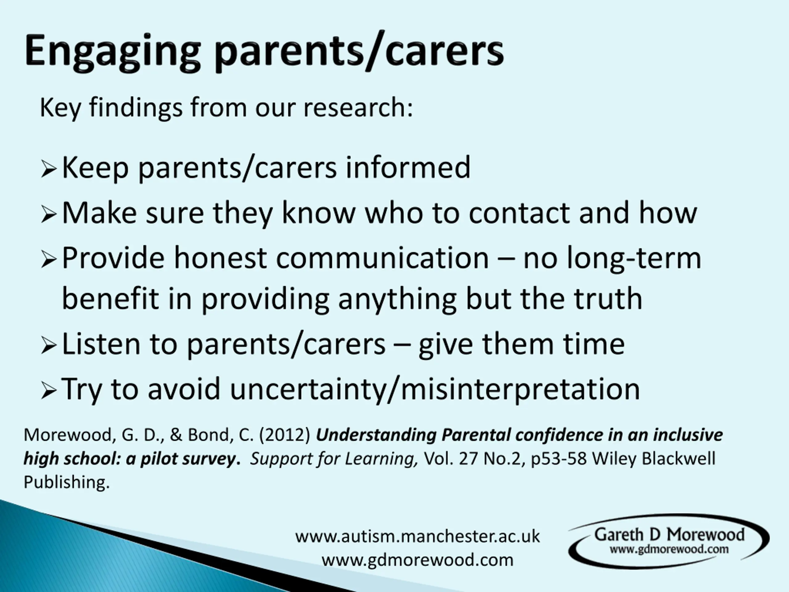 Key findings from our research: Keep parents/carers informed Make sure they know who to contact and how Provide honest communication no long-term benefit in providing anything but the truth Listen to parents/carers give them time Try to avoid uncertainty/misinterpretation Morewood, G. D., & Bond, C. (2012)Understanding Parental confidence in an inclusive high school: a pilot survey.Support for Learning, Vol. 27 No.2, p53-58 Wiley Blackwell Publishing. www.autism.manchester.ac.uk www.gdmorewood.com