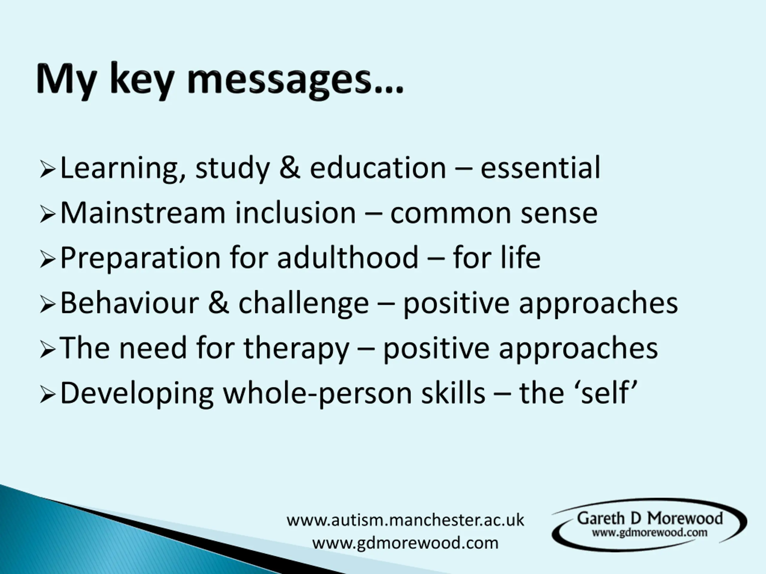Learning, study & education essential Mainstream inclusion common sense Preparation for adulthood for life Behaviour & challenge positive approaches The need for therapy positive approaches Developing whole-person skills the self www.autism.manchester.ac.uk www.gdmorewood.com