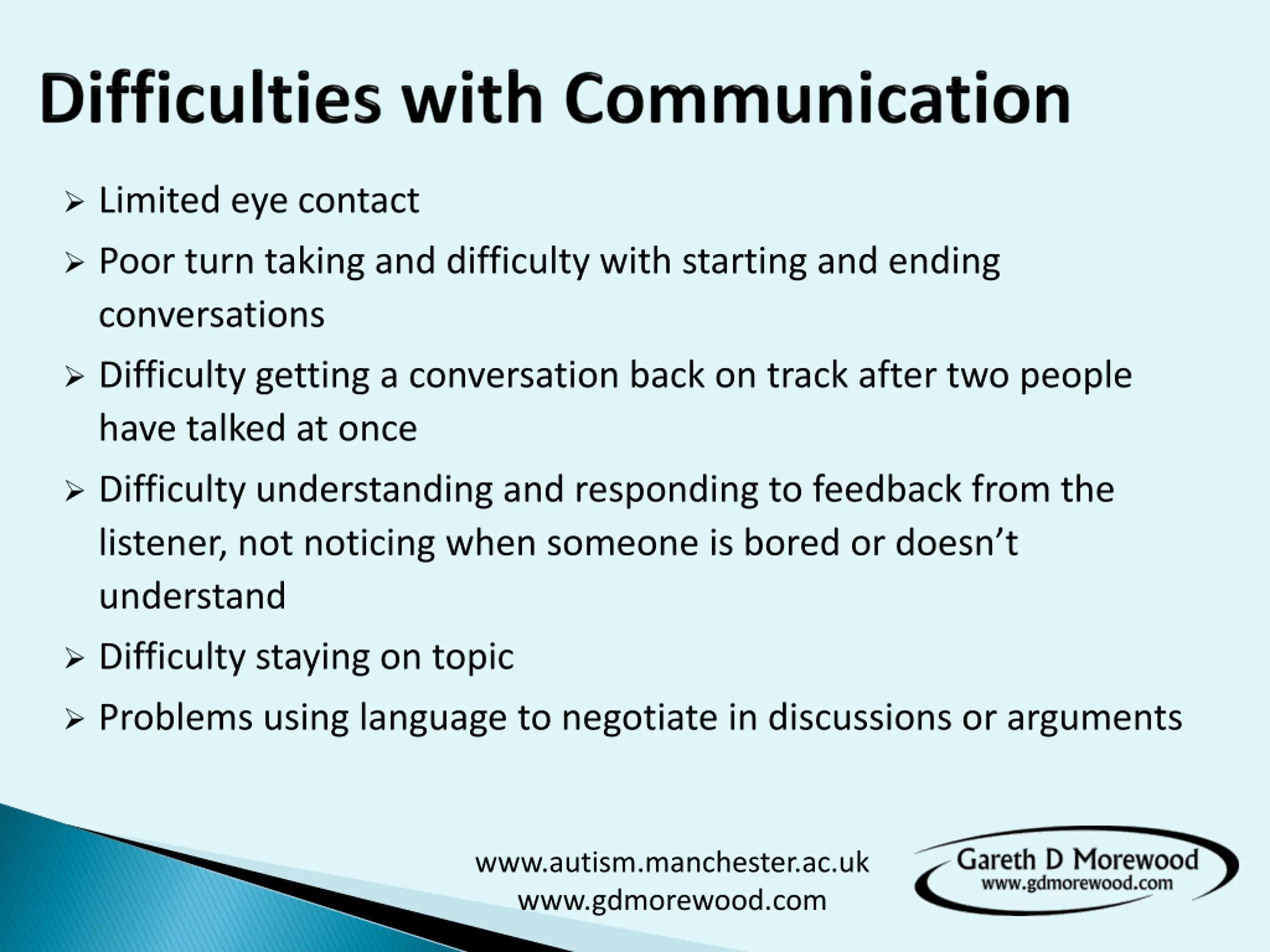 Limited eye contact Poor turn taking and difficulty with starting and ending conversations Difficulty getting a conversation back on track after two people have talked at once Difficulty understanding and responding to feedback from the listener, not noticing when someone is bored or doesn t understand Difficulty staying on topic Problems using language to negotiate in discussions or arguments www.autism.manchester.ac.uk www.gdmorewood.com