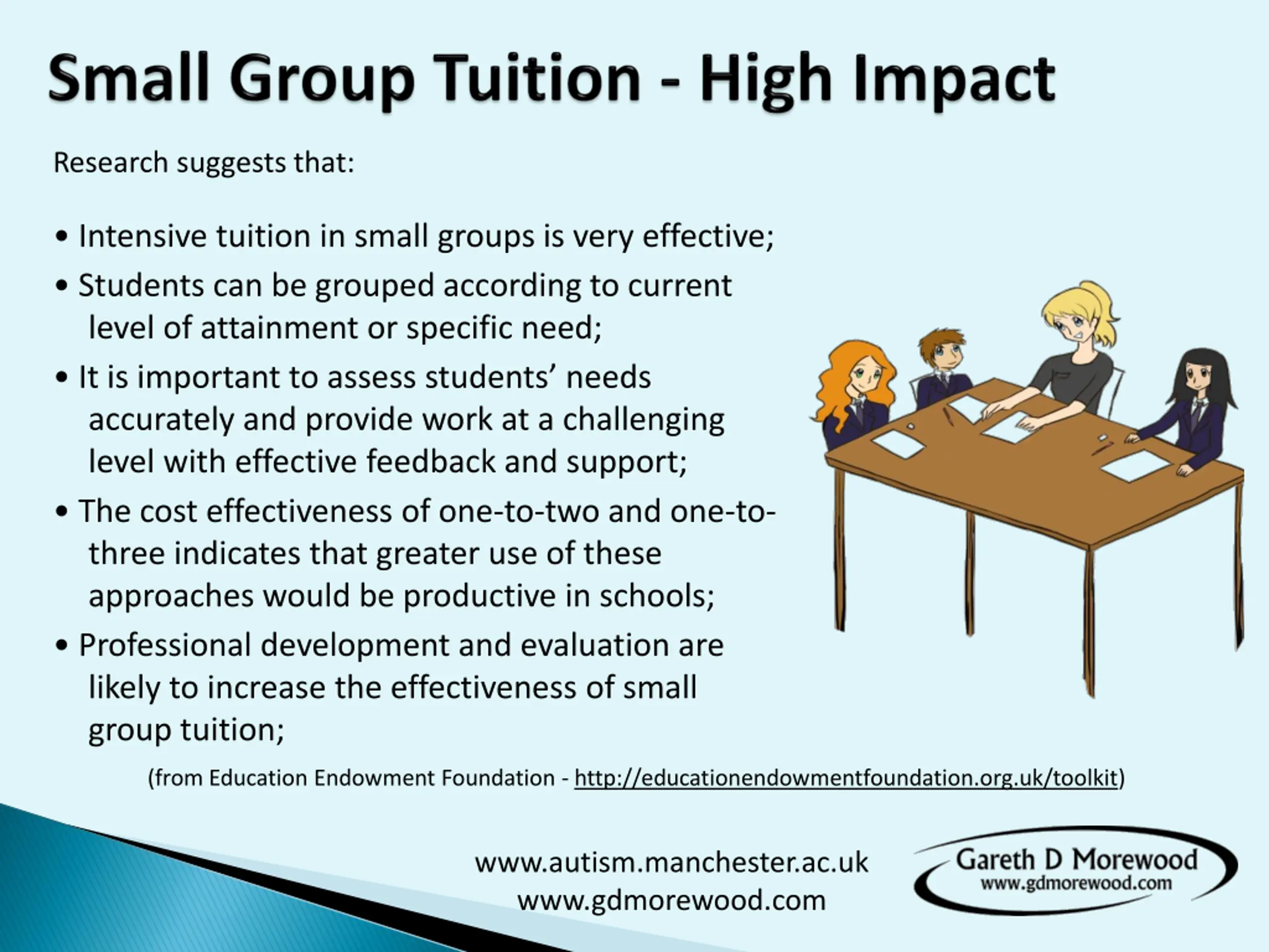 Research suggests that: Intensive tuition in small groups is very effective; Students can be grouped according to current level of attainment or specific need; It is important to assess students needs accurately and provide work at a challenging level with effective feedback and support; The cost effectiveness of one-to-two and one-to- three indicates that greater use of these approaches would be productive in schools; Professional development and evaluation are likely to increase the effectiveness of small group tuition; (from Education Endowment Foundation - http://educationendowmentfoundation.org.uk/toolkit) www.autism.manchester.ac.uk www.gdmorewood.com