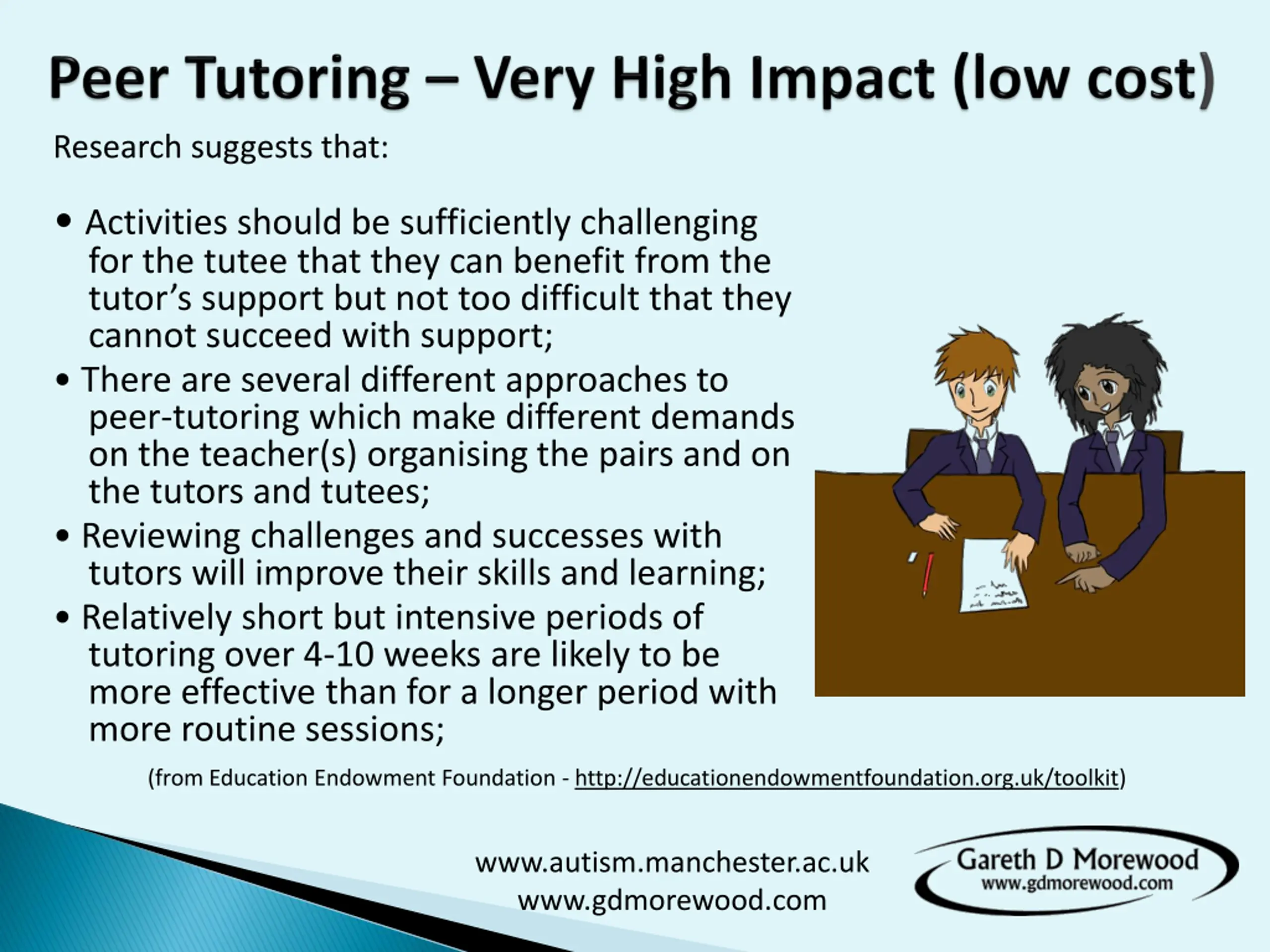 Research suggests that: Activities should be sufficiently challenging for the tutee that they can benefit from the tutor s support but not too difficult that they cannot succeed with support; There are several different approaches to peer-tutoring which make different demands on the teacher(s) organising the pairs and on the tutors and tutees; Reviewing challenges and successes with tutors will improve their skills and learning; Relatively short but intensive periods of tutoring over 4-10 weeks are likely to be more effective than for a longer period with more routine sessions; (from Education Endowment Foundation - http://educationendowmentfoundation.org.uk/toolkit) www.autism.manchester.ac.uk www.gdmorewood.com