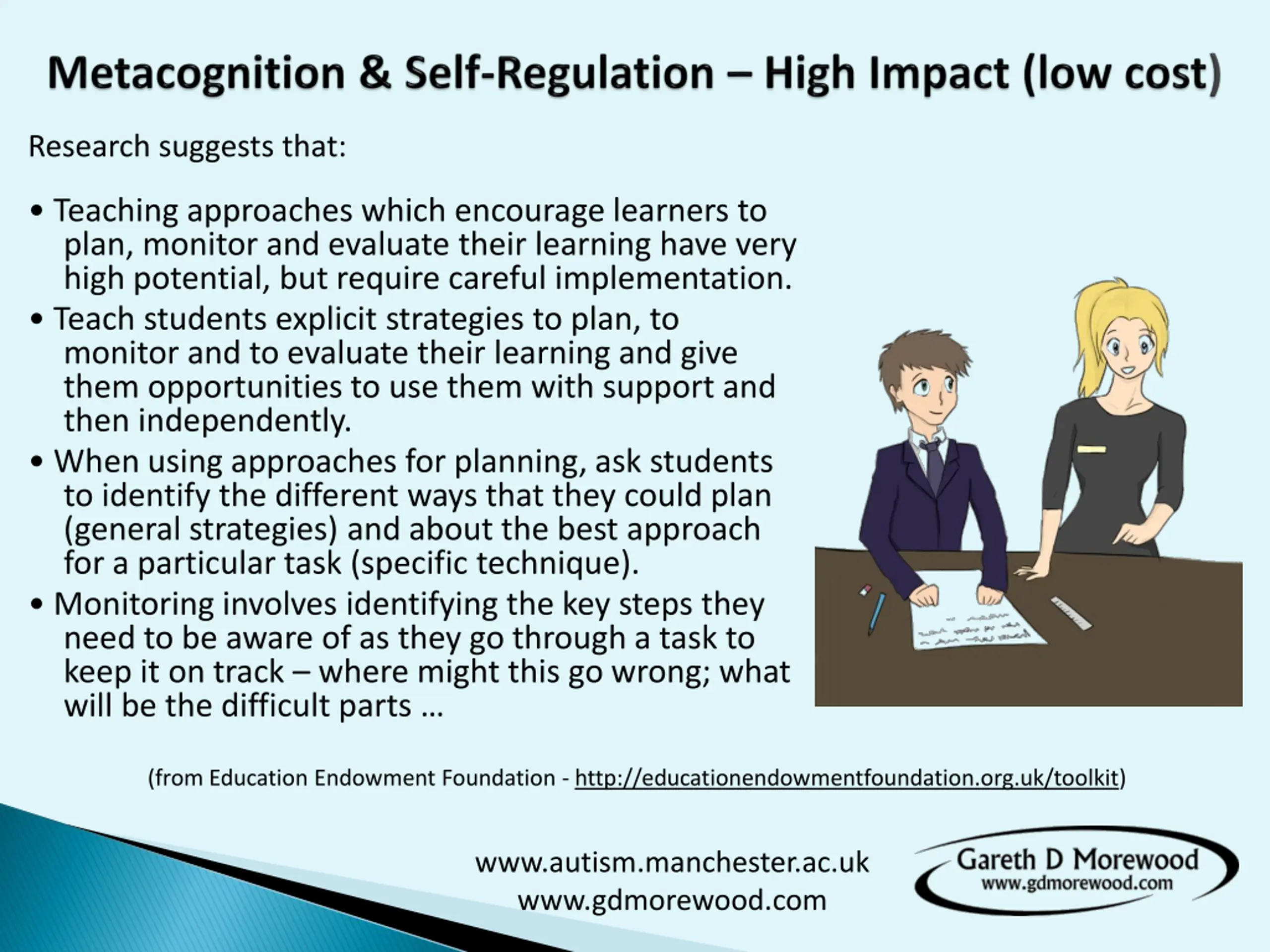 Research suggests that: Teaching approaches which encourage learners to plan, monitor and evaluate their learning have very high potential, but require careful implementation. Teach students explicit strategies to plan, to monitor and to evaluate their learning and give them opportunities to use them with support and then independently. When using approaches for planning, ask students to identify the different ways that they could plan (general strategies) and about the best approach for a particular task (specific technique). Monitoring involves identifying the key steps they need to be aware of as they go through a task to keep it on track where might this go wrong; what will be the difficult parts (from Education Endowment Foundation - http://educationendowmentfoundation.org.uk/toolkit) www.autism.manchester.ac.uk www.gdmorewood.com