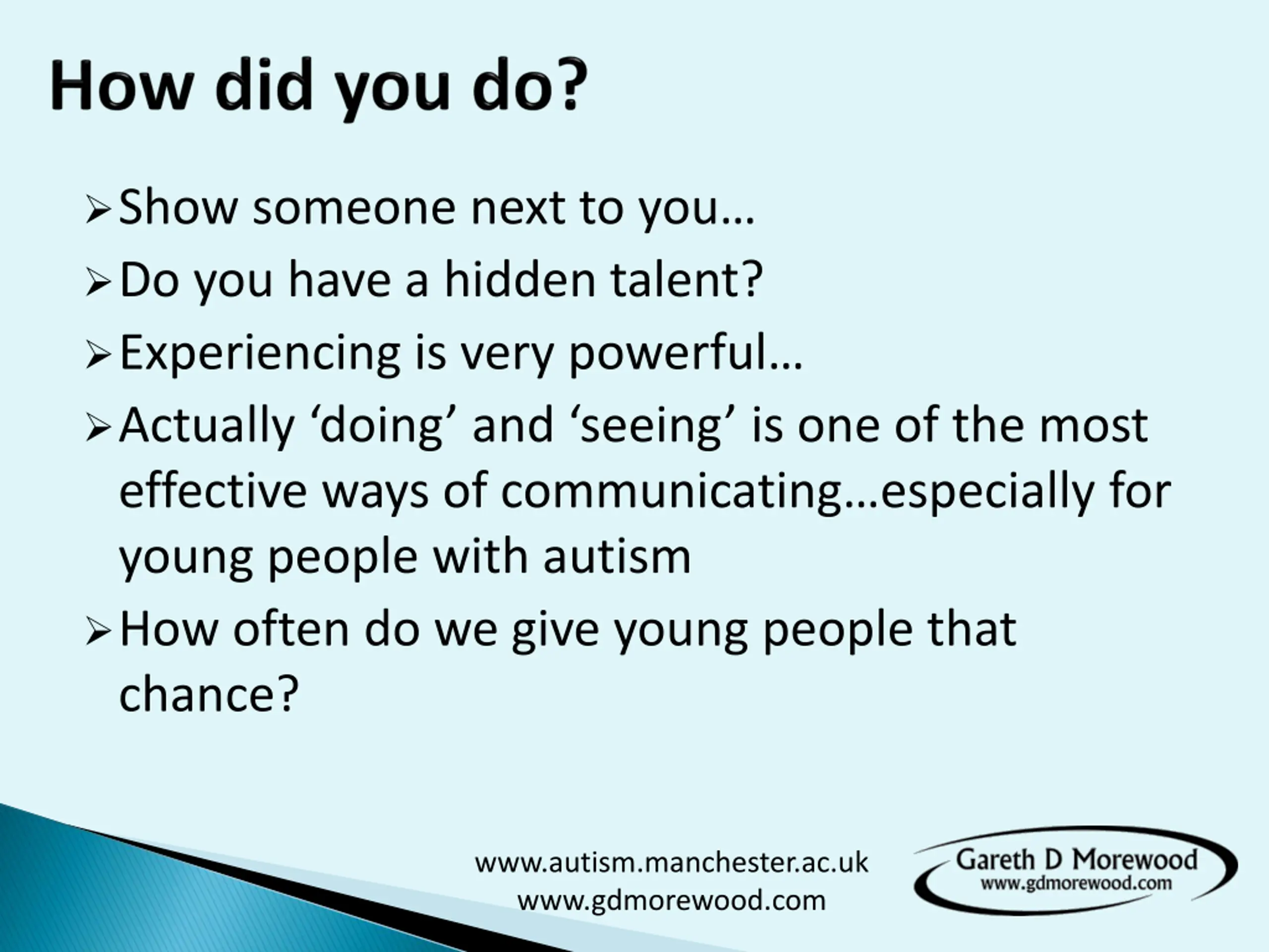 Show someone next to you Do you have a hidden talent? Experiencing is very powerful Actually doing and seeing is one of the most effective ways of communicating especially for young people with autism How often do we give young people that chance? www.autism.manchester.ac.uk www.gdmorewood.com