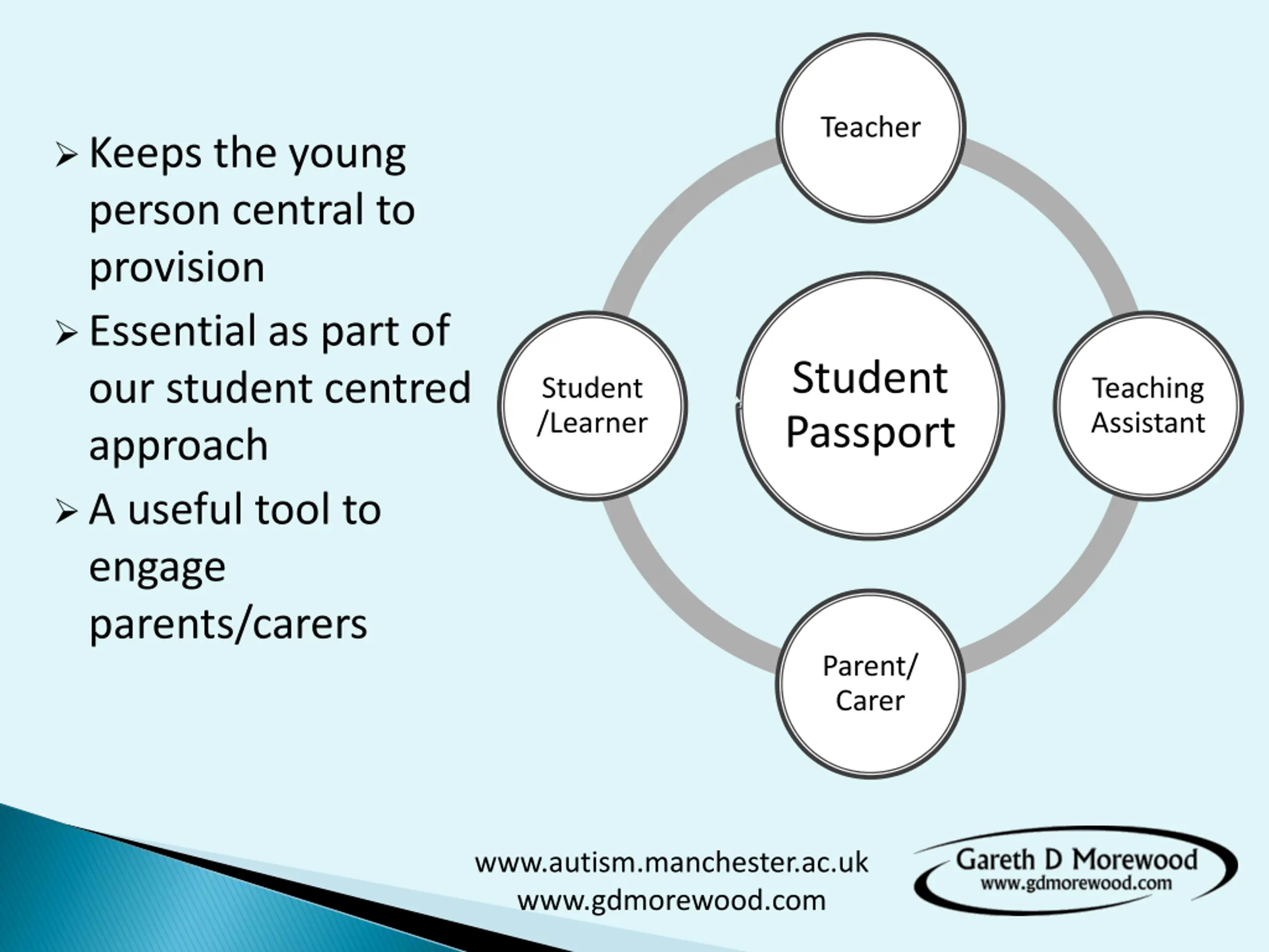 Teacher Keeps the young person central to provision Essential as part of our student centred approach A useful tool to engage parents/carers Student Passport Student /Learner Teaching Assistant Parent/ Carer www.autism.manchester.ac.uk www.gdmorewood.com
