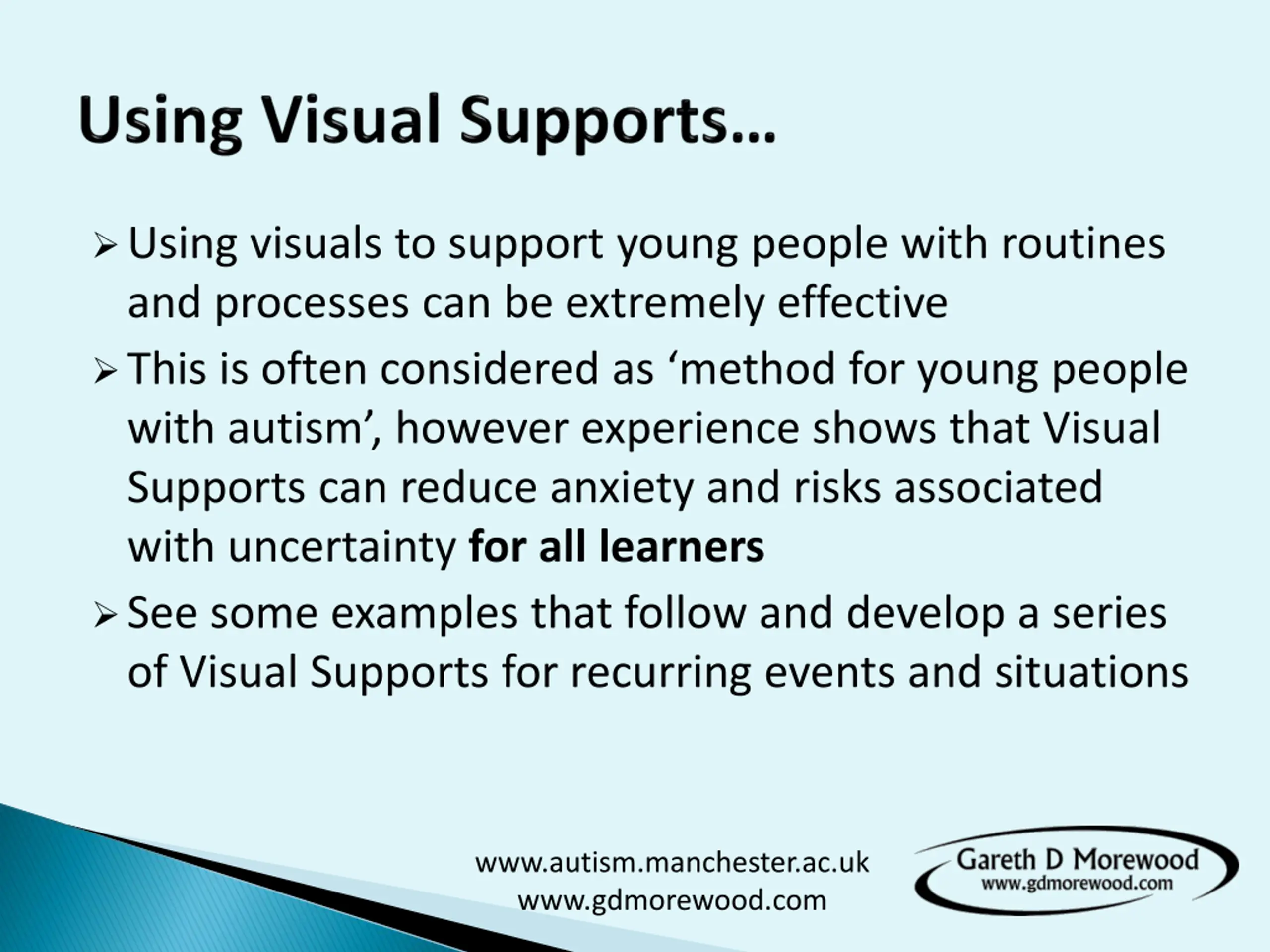 Using visuals to support young people with routines and processes can be extremely effective This is often considered as method for young people with autism , however experience shows that Visual Supports can reduce anxiety and risks associated with uncertainty for all learners See some examples that follow and develop a series of Visual Supports for recurring events and situations www.autism.manchester.ac.uk www.gdmorewood.com