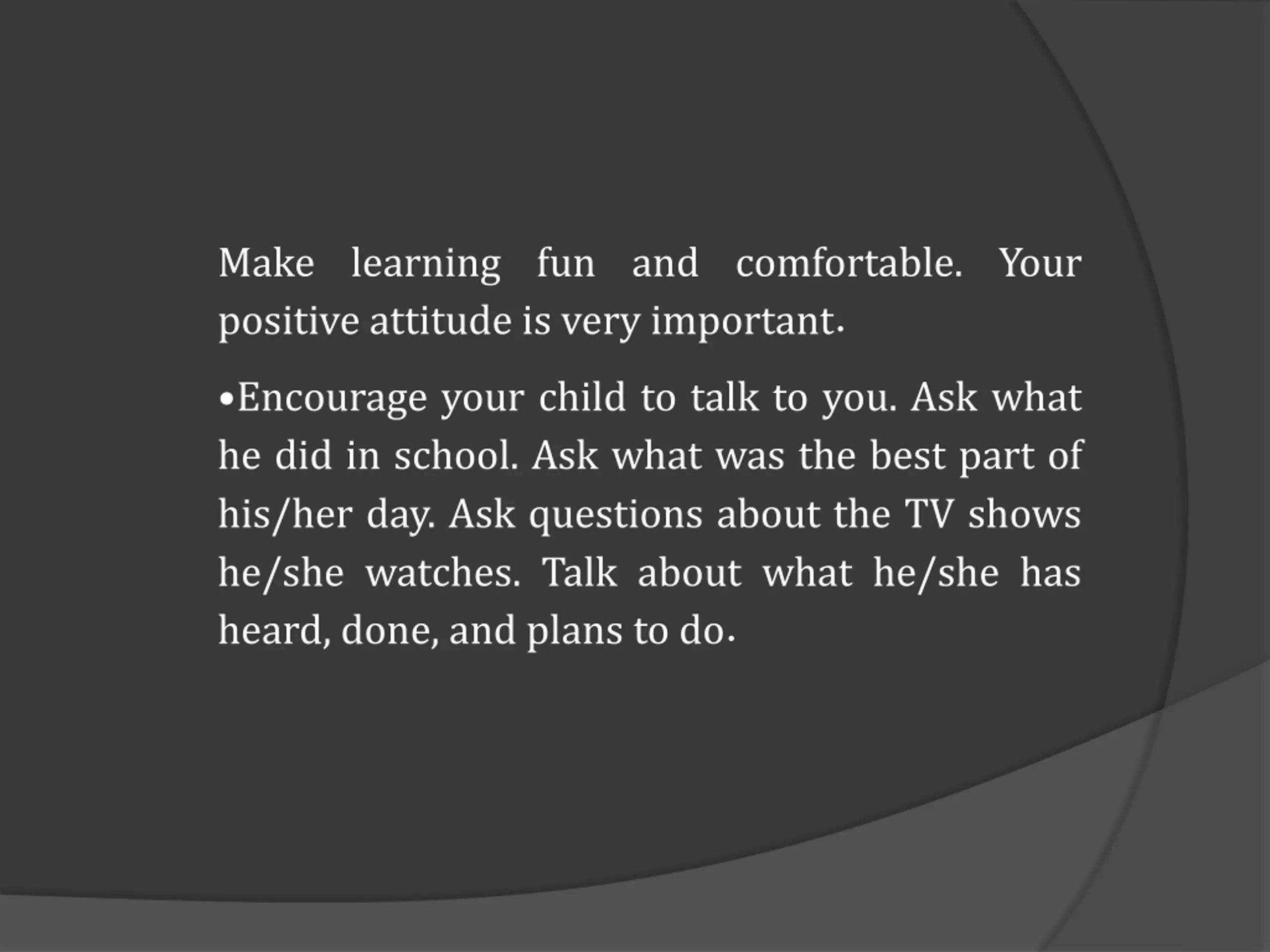 Make learning fun and comfortable. Your positive attitude is very important. Encourage your child to talk to you. Ask what he did in school. Ask what was the best part of his/her day. Ask questions about the TV shows he/she watches. Talk about what he/she has heard, done, and plans to do.