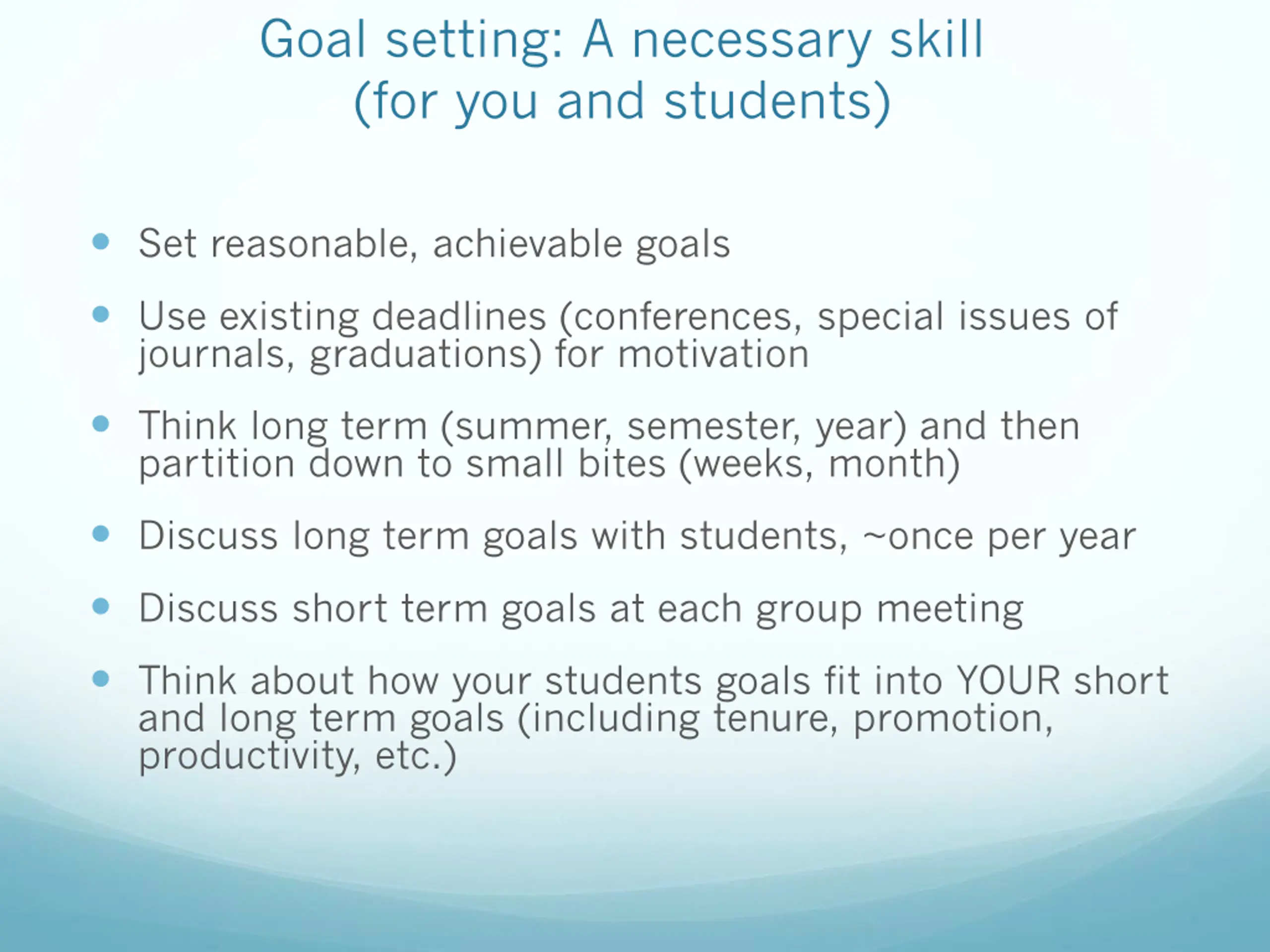 Goal setting: A necessary skill (for you and students) Set reasonable, achievable goals Use existing deadlines (conferences, special issues of journals, graduations) for motivation Think long term (summer, semester, year) and then partition down to small bites (weeks, month) Discuss long term goals with students, ~once per year Discuss short term goals at each group meeting Think about how your students goals fit into YOUR short and long term goals (including tenure, promotion, productivity, etc.)