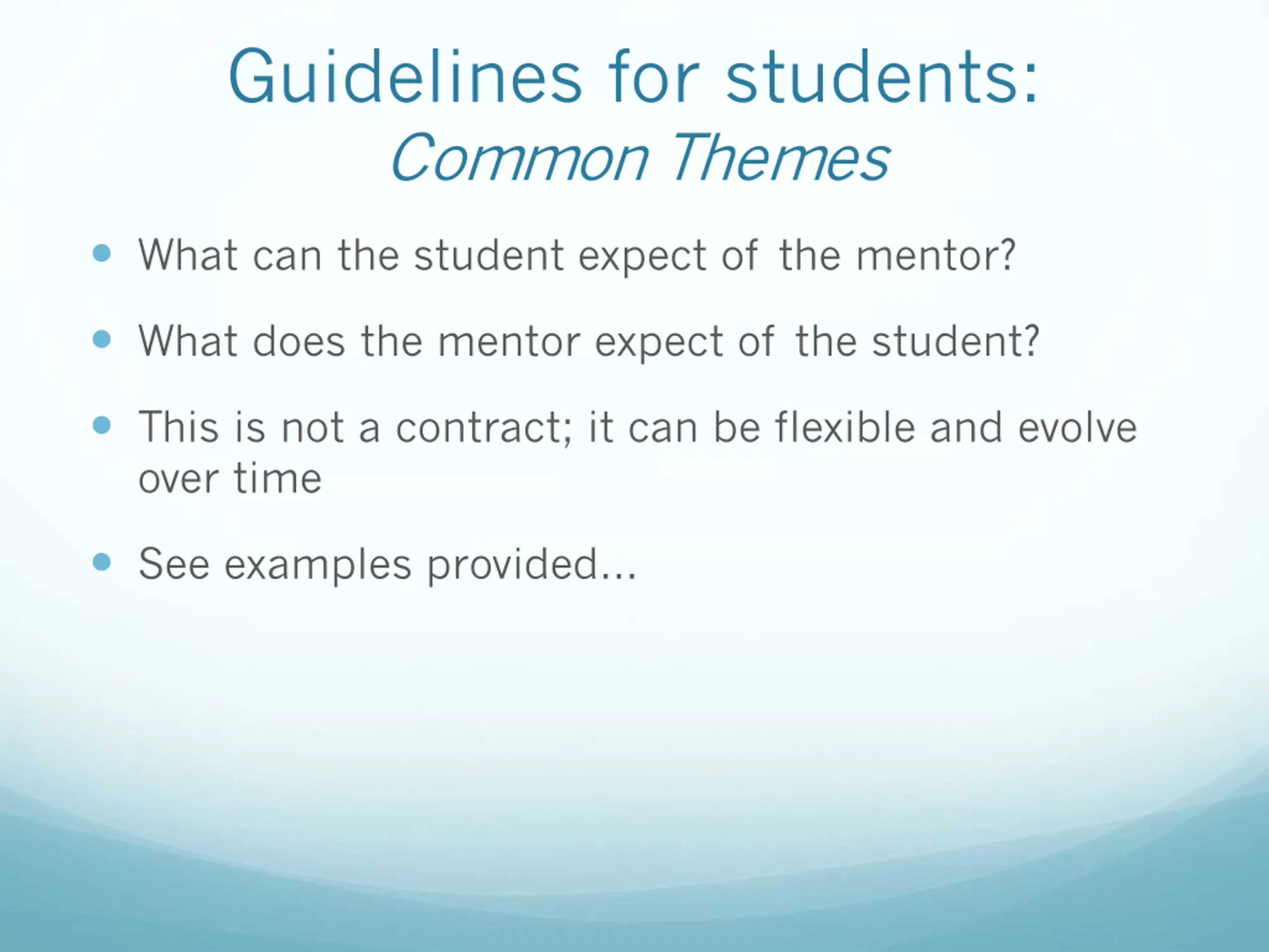 Guidelines for students: Common Themes What can the student expect of the mentor? What does the mentor expect of the student? This is not a contract; it can be flexible and evolve over time See examples provided