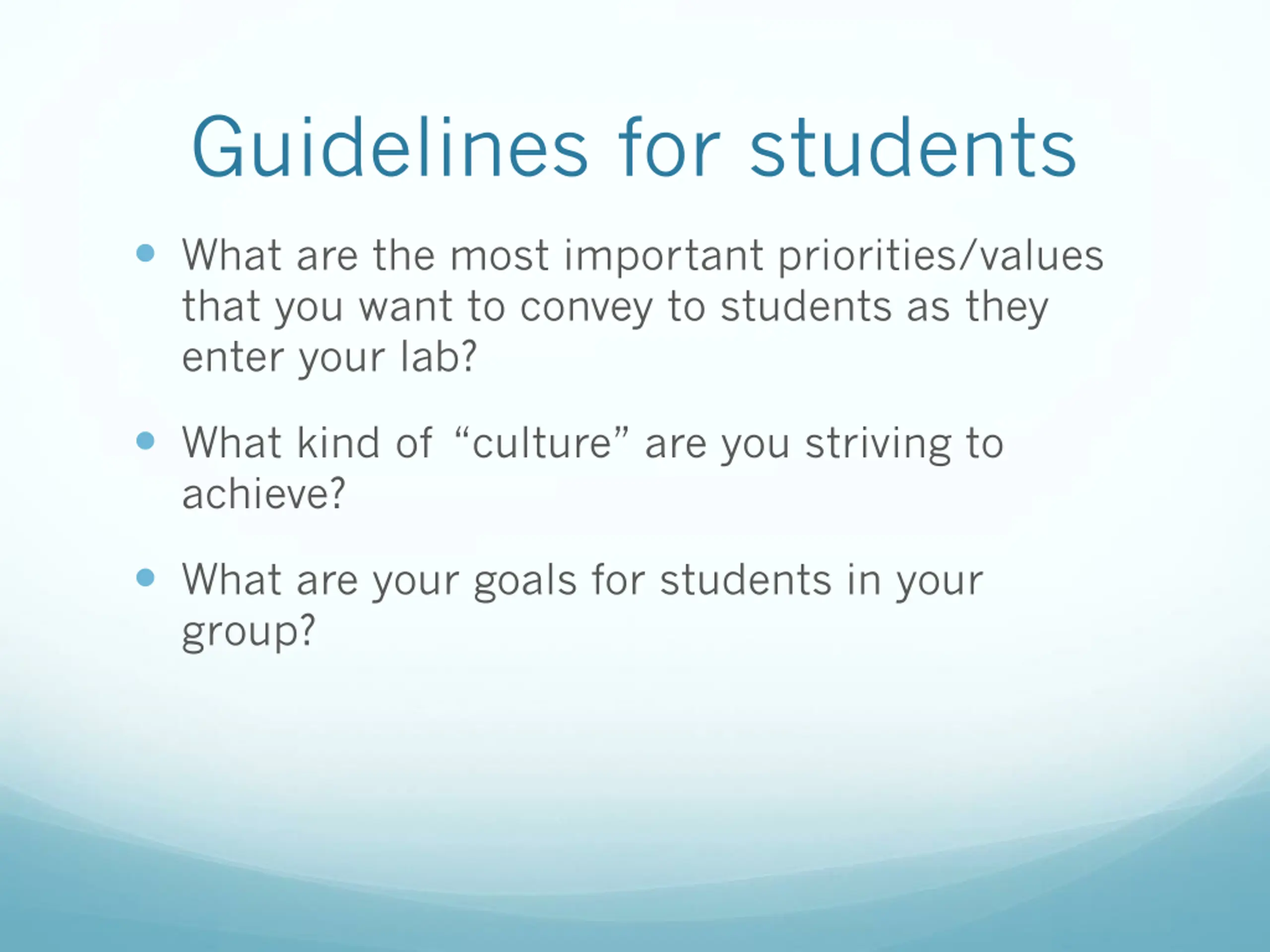 Guidelines for students What are the most important priorities/values that you want to convey to students as they enter your lab? What kind of culture are you striving to achieve? What are your goals for students in your group?