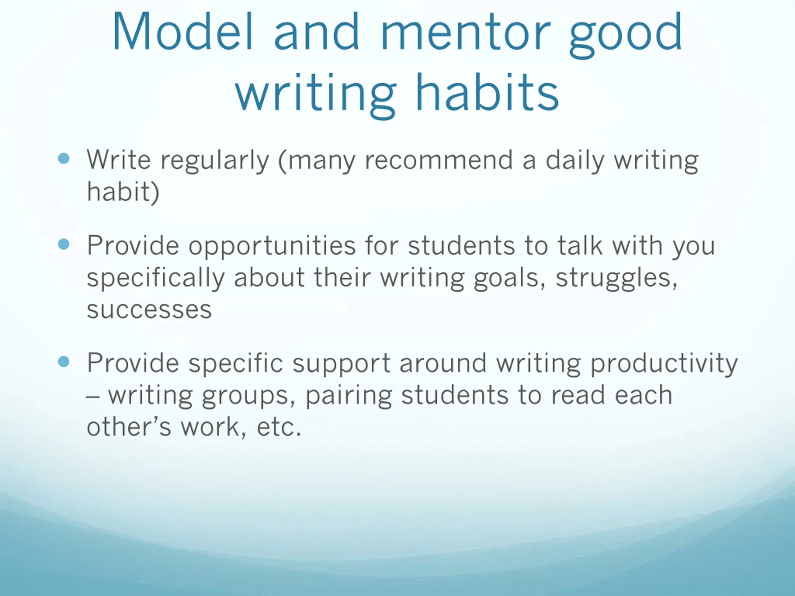 Model and mentor good writing habits Write regularly (many recommend a daily writing habit) Provide opportunities for students to talk with you specifically about their writing goals, struggles, successes Provide specific support around writing productivity writing groups, pairing students to read each other s work, etc.