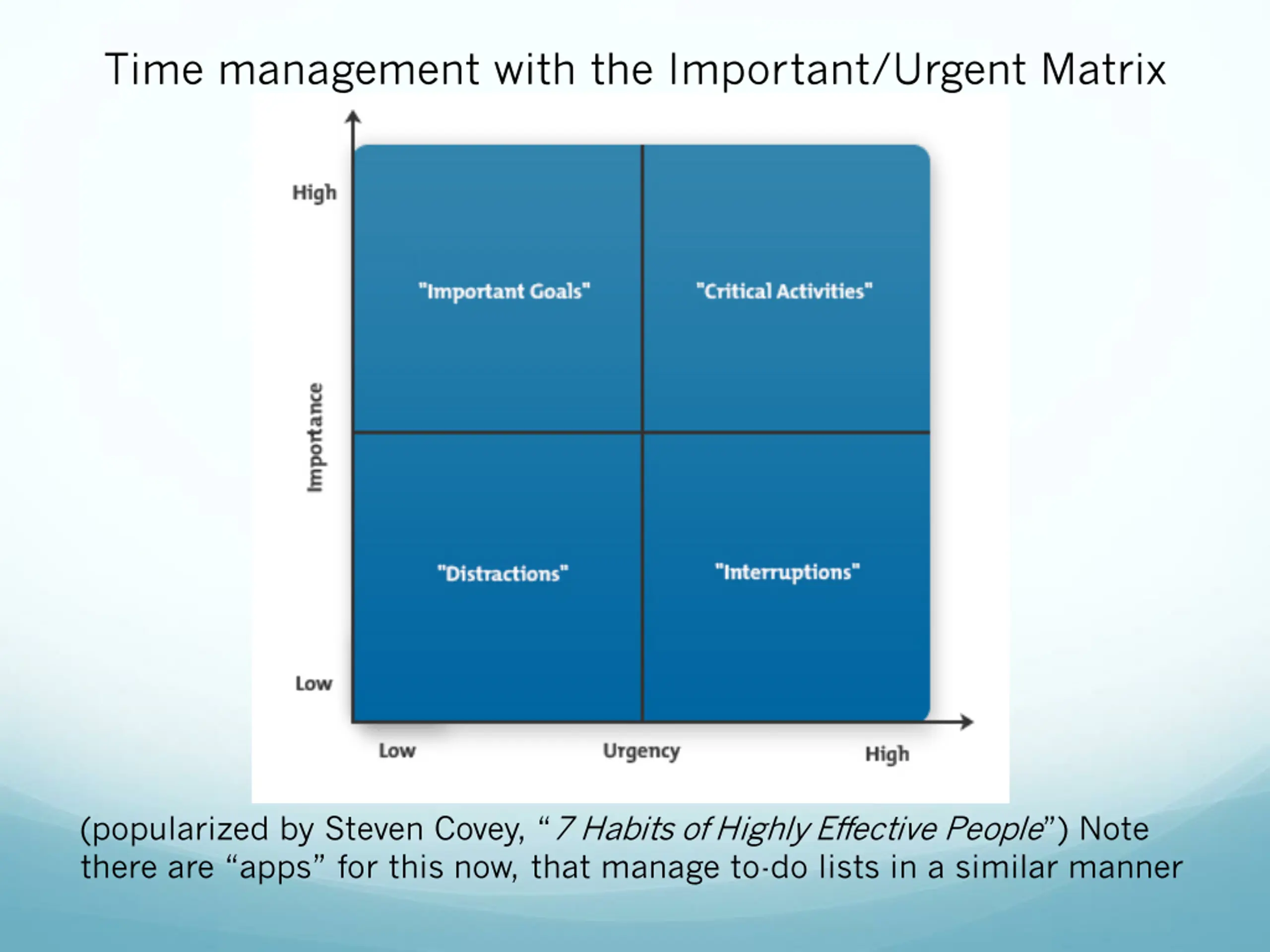 Time management with the Important/Urgent Matrix (popularized by Steven Covey, 7 Habits of Highly Effective People ) Note there are apps for this now, that manage to-do lists in a similar manner