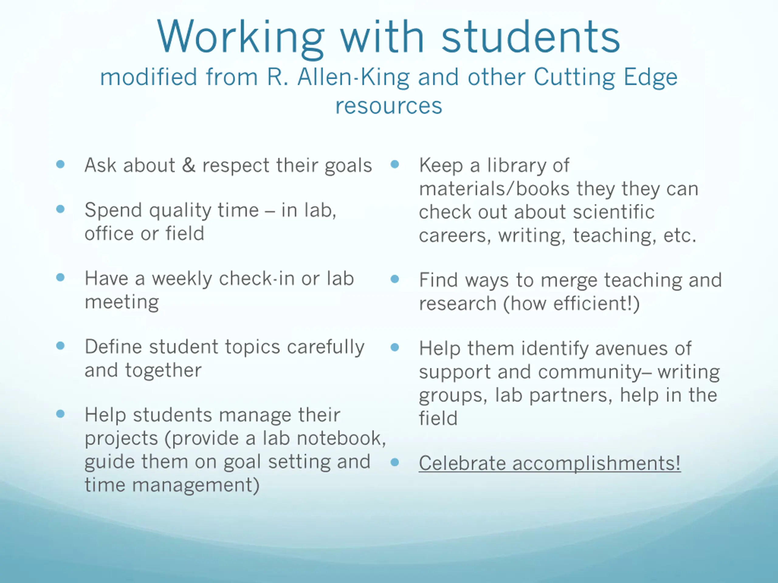 Working with students modified from R. Allen-King and other Cutting Edge resources Ask about & respect their goals Keep a library of materials/books they they can check out about scientific careers, writing, teaching, etc. Spend quality time in lab, office or field Have a weekly check-in or lab meeting Find ways to merge teaching and research (how efficient!) Define student topics carefully and together Help them identify avenues of support and community writing groups, lab partners, help in the field Help students manage their projects (provide a lab notebook, guide them on goal setting and time management) Celebrate accomplishments!