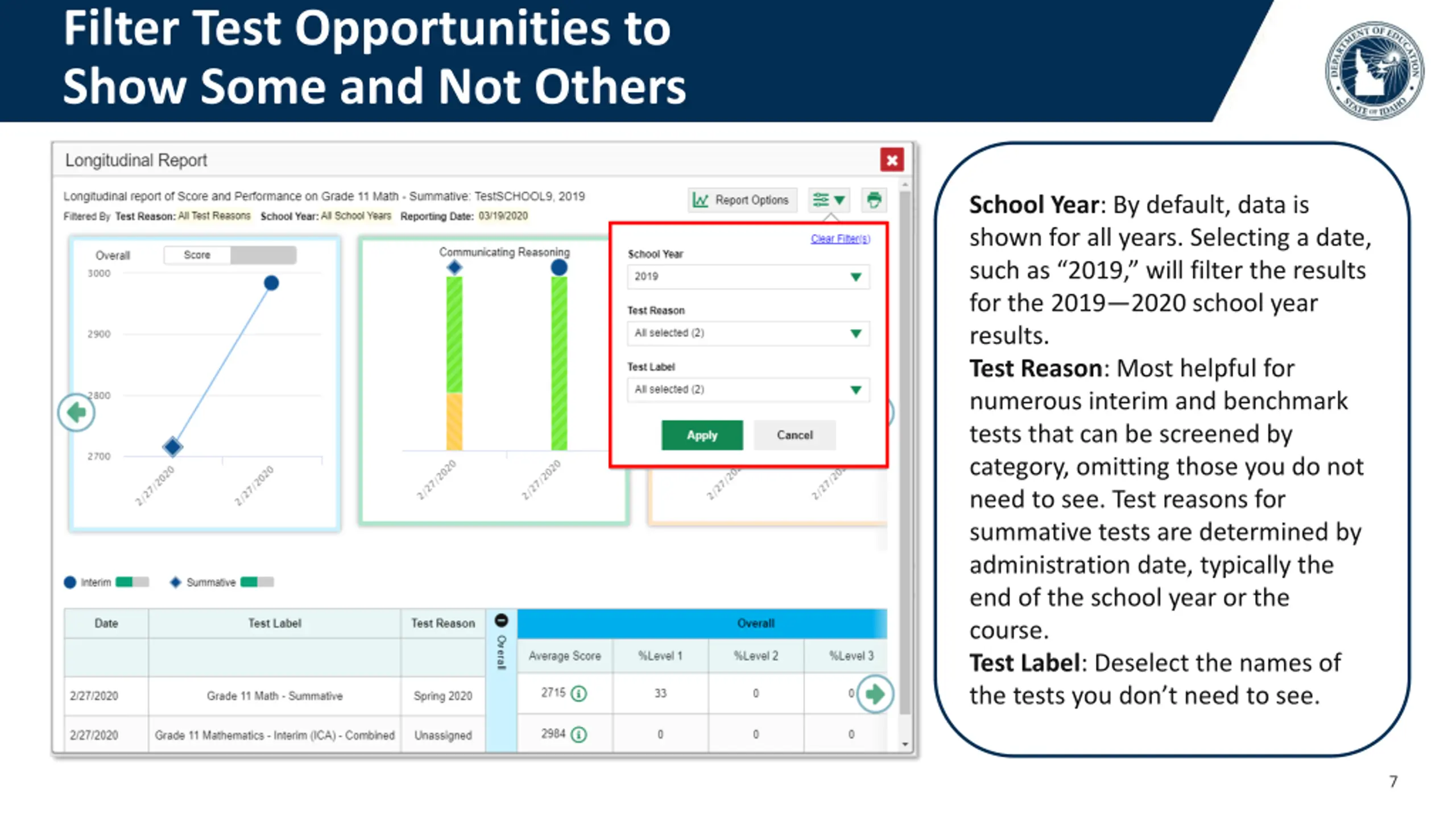 Filter Test Opportunities to Show Some and Not Others School Year: By default, data is shown for all years. Selecting a date, such as 2019, will filter the results for the 2019 2020 school year results. Test Reason: Most helpful for numerous interim and benchmark tests that can be screened by category, omitting those you do not need to see. Test reasons for summative tests are determined by administration date, typically the end of the school year or the course. Test Label: Deselect the names of the tests you don t need to see. 7