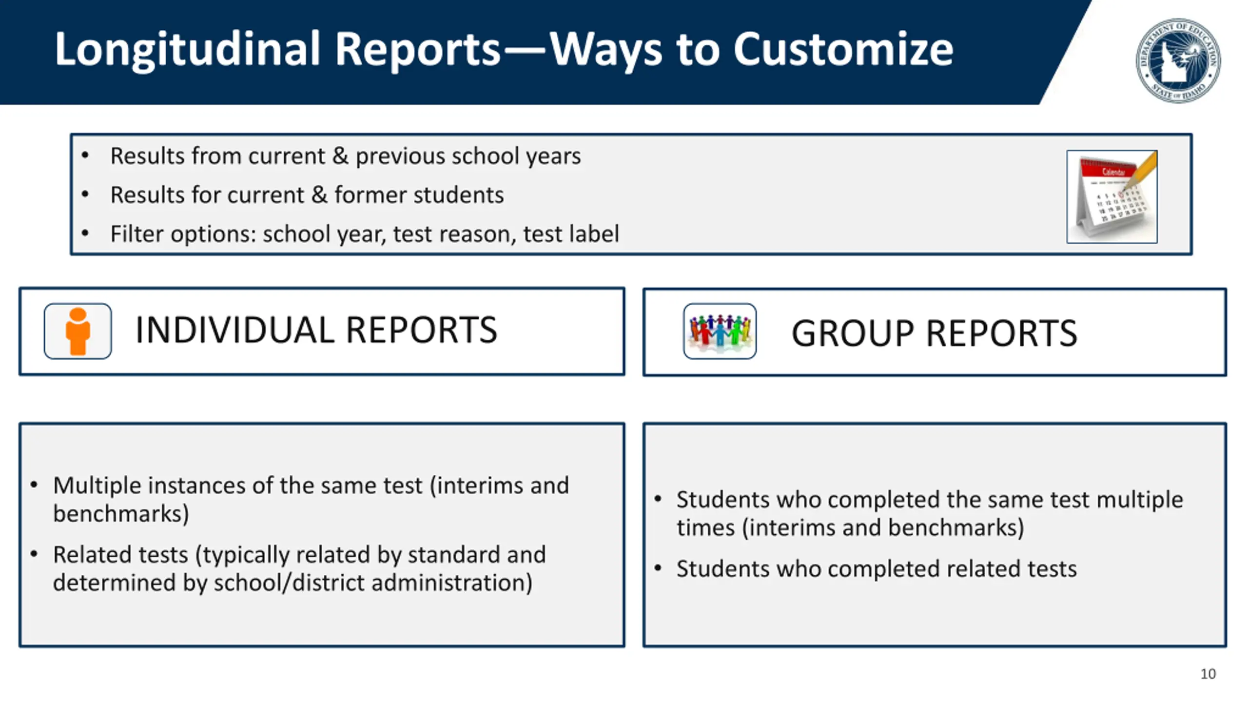 Longitudinal ReportsWays to Customize Results from current & previous school years Results for current & former students Filter options: school year, test reason, test label INDIVIDUAL REPORTS GROUP REPORTS Multiple instances of the same test (interims and benchmarks) Related tests (typically related by standard and determined by school/district administration) Students who completed the same test multiple times (interims and benchmarks) Students who completed related tests 10