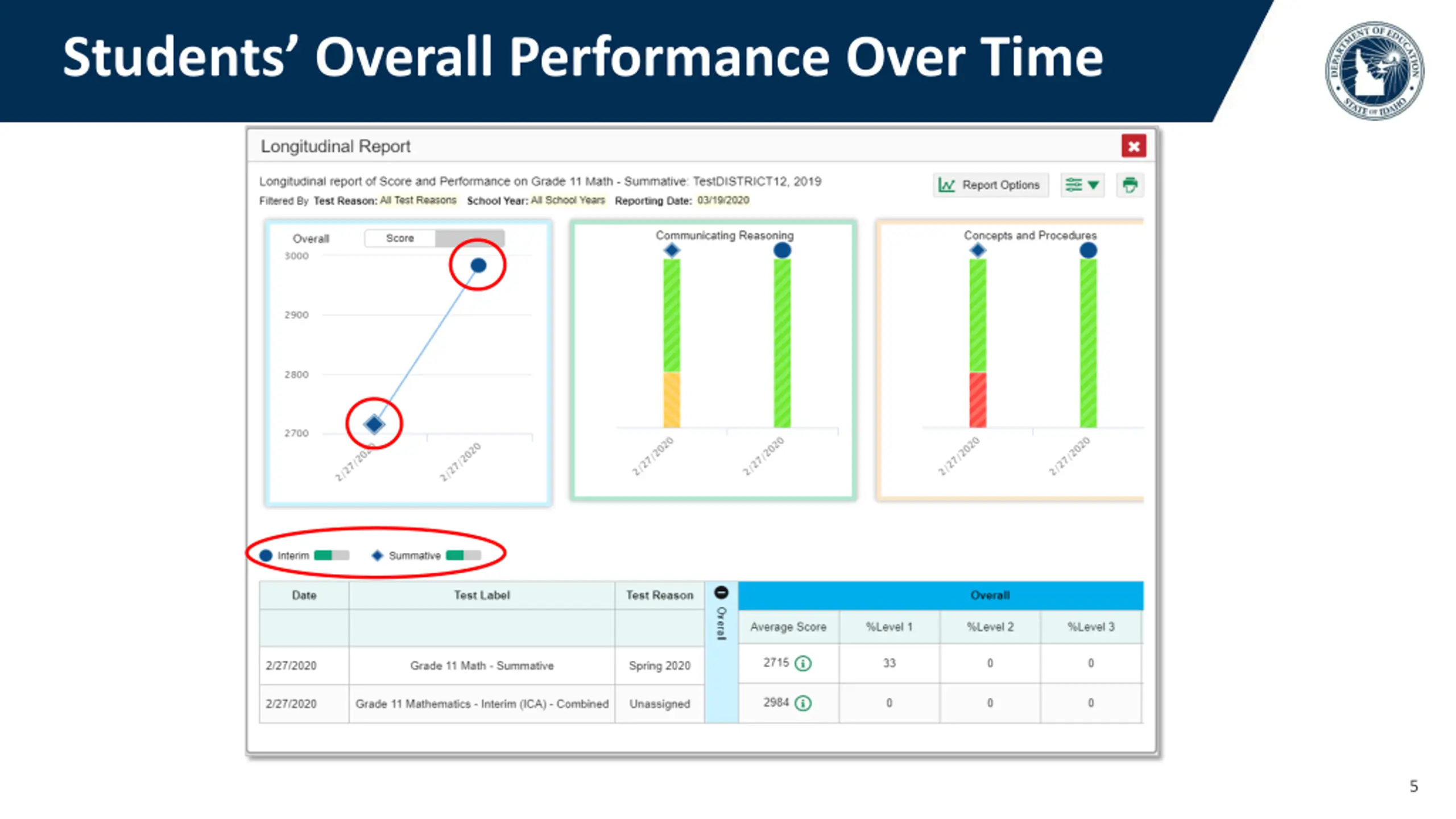 Progression Options Feature Drop-down options are: Summatives Interims Both Only students highlighted in yellow will appear on the Longitudinal Report 4