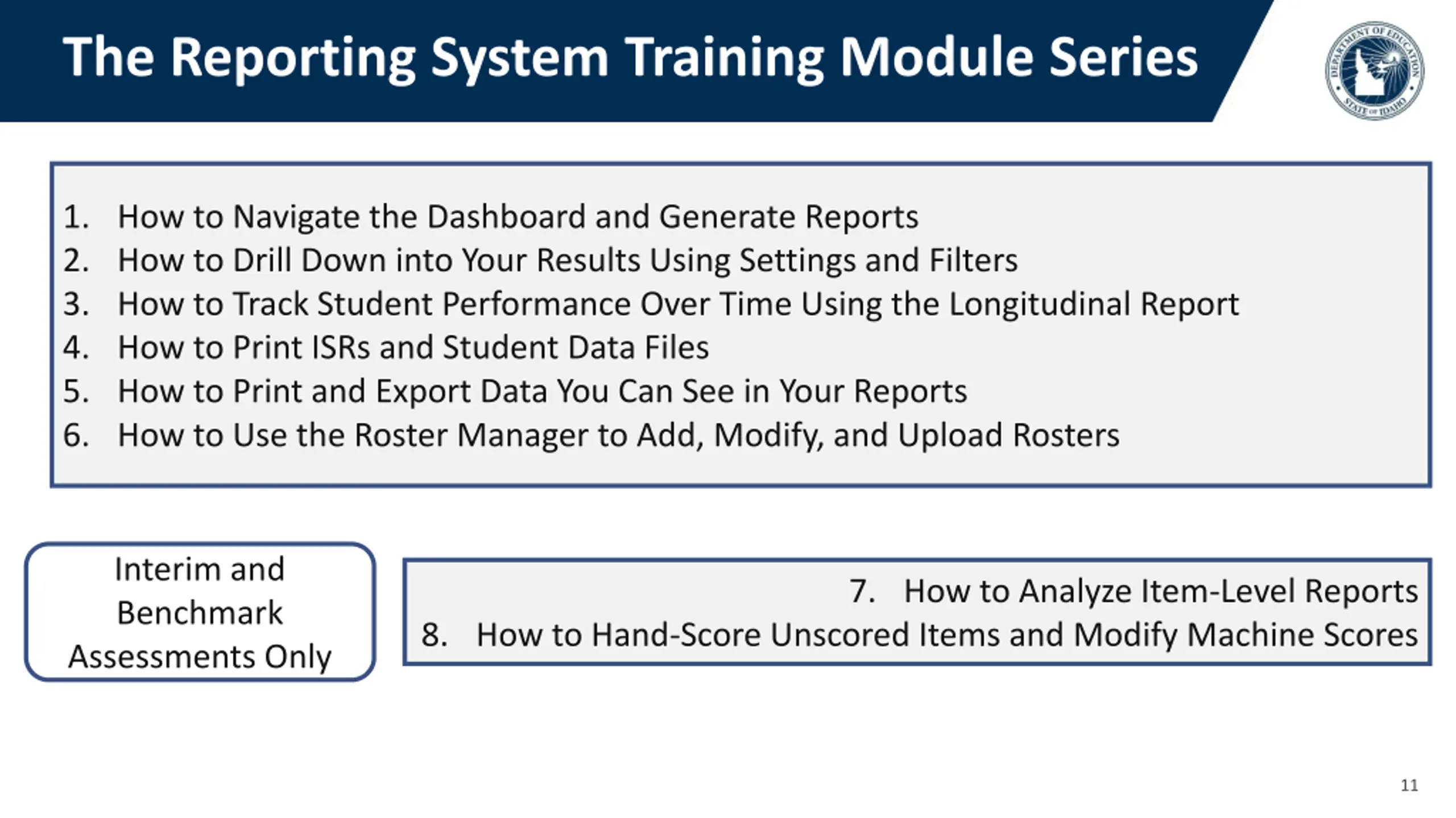 The Reporting System Training Module Series 1. How to Navigate the Dashboard and Generate Reports 2. How to Drill Down into Your Results Using Settings and Filters 3. How to Track Student Performance Over Time Using the Longitudinal Report 4. How to Print ISRs and Student Data Files 5. How to Print and Export Data You Can See in Your Reports 6. How to Use the Roster Manager to Add, Modify, and Upload Rosters Interim and Benchmark Assessments Only 7. How to Analyze Item-Level Reports 8. How to Hand-Score Unscored Items and Modify Machine Scores 11