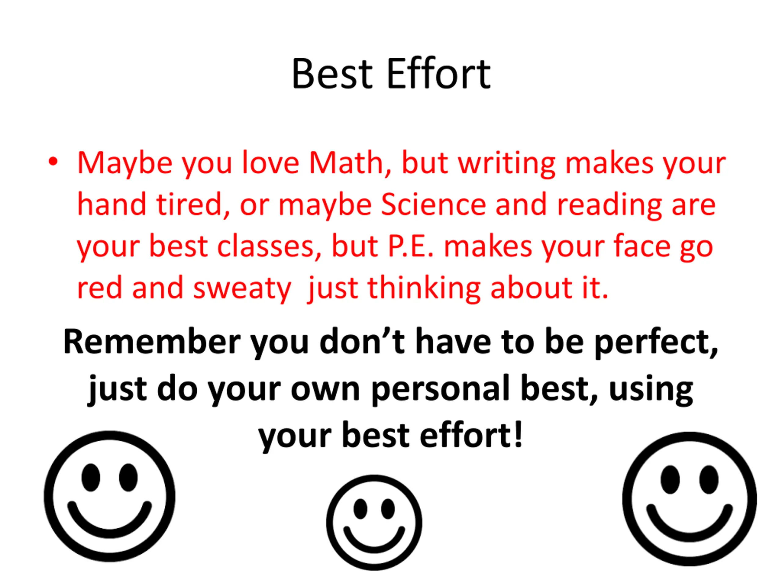 Best Effort Maybe you love Math, but writing makes your hand tired, or maybe Science and reading are your best classes, but P.E. makes your face go red and sweaty just thinking about it. Remember you don t have to be perfect, just do your own personal best, using your best effort!