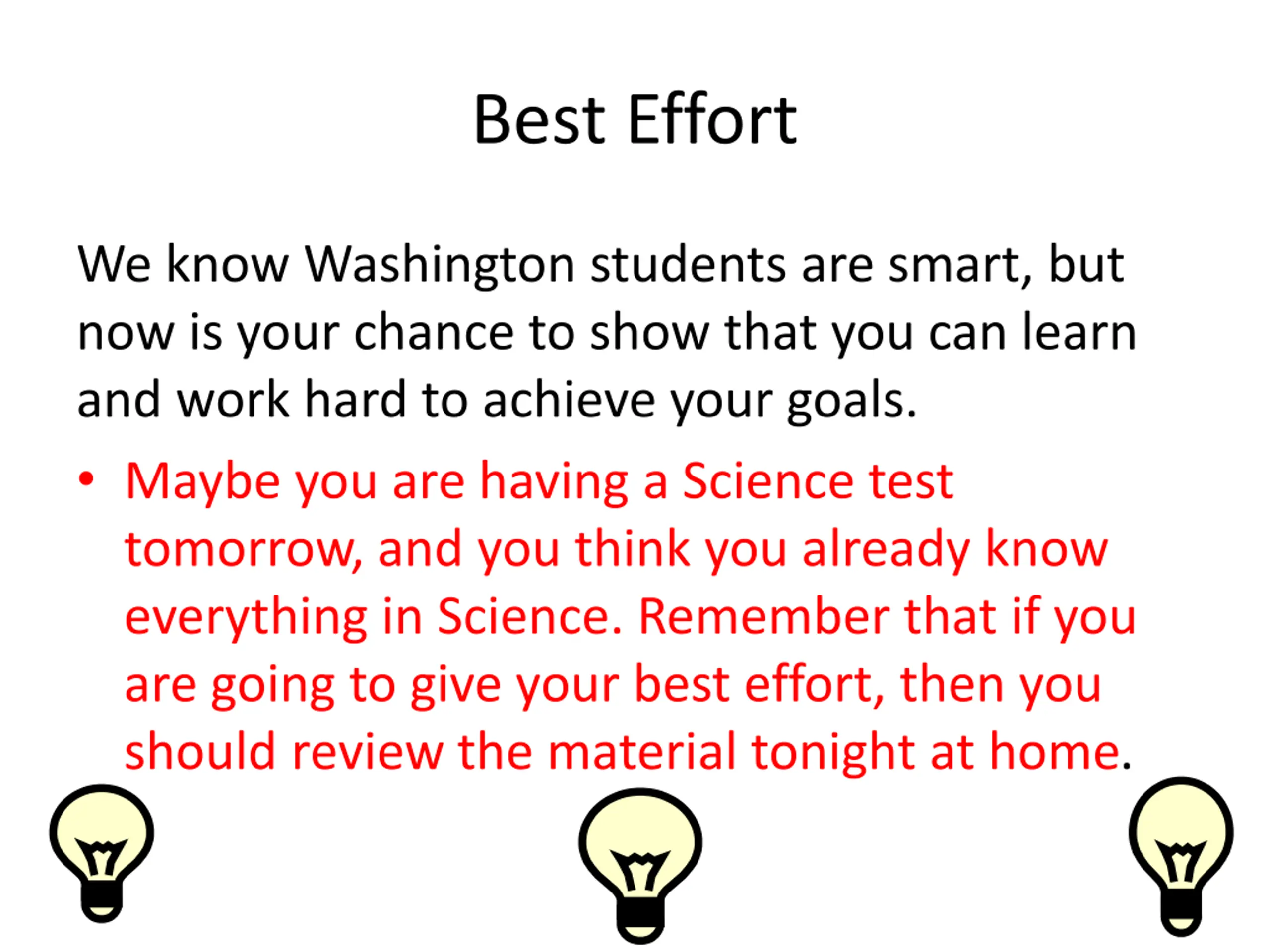 Best Effort We know Washington students are smart, but now is your chance to show that you can learn and work hard to achieve your goals. Maybe you are having a Science test tomorrow, and you think you already know everything in Science. Remember that if you are going to give your best effort, then you should review the material tonight at home.