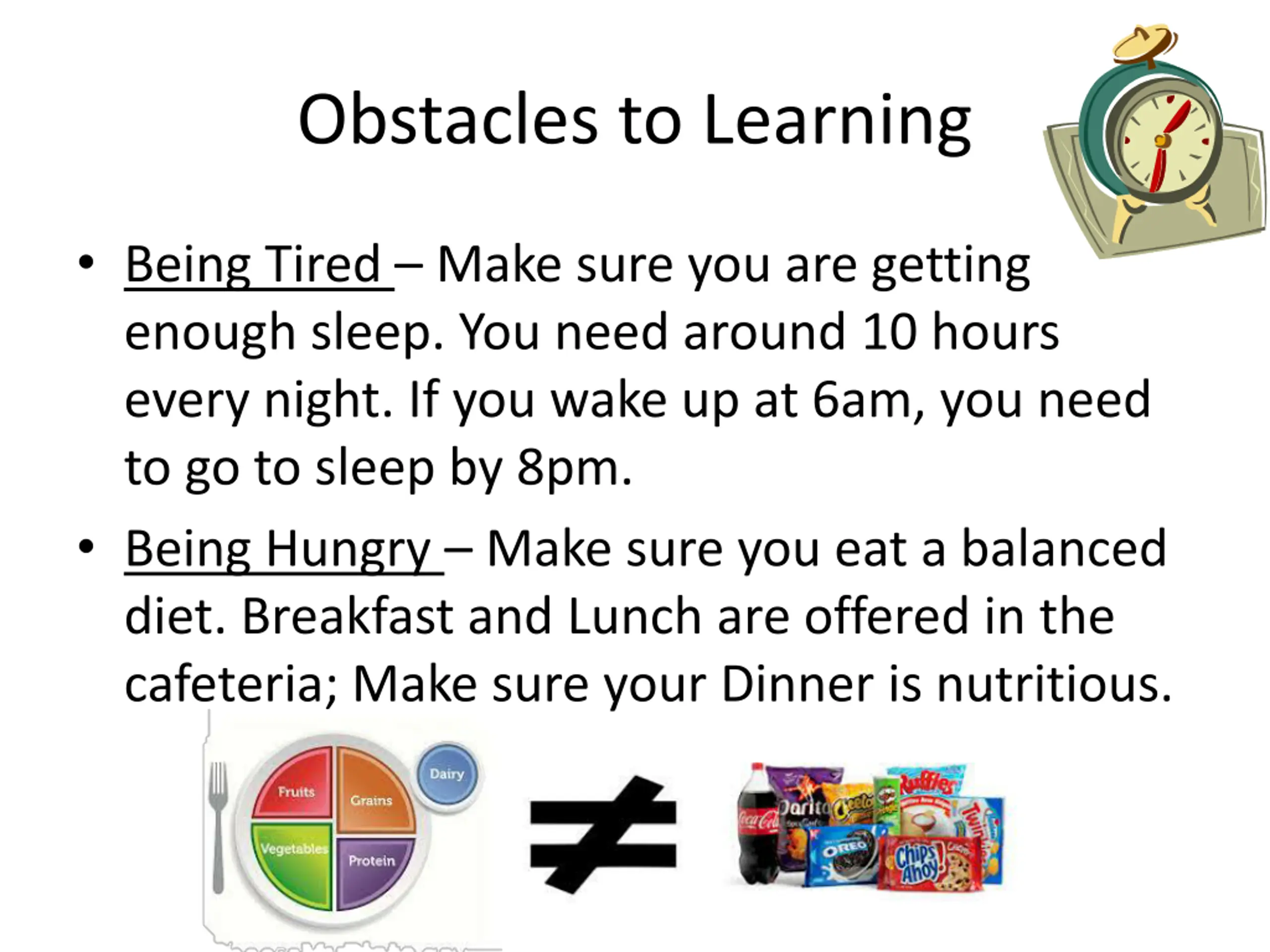 Obstacles to Learning Being Tired Make sure you are getting enough sleep. You need around 10 hours every night. If you wake up at 6am, you need to go to sleep by 8pm. Being Hungry Make sure you eat a balanced diet. Breakfast and Lunch are offered in the cafeteria; Make sure your Dinner is nutritious.