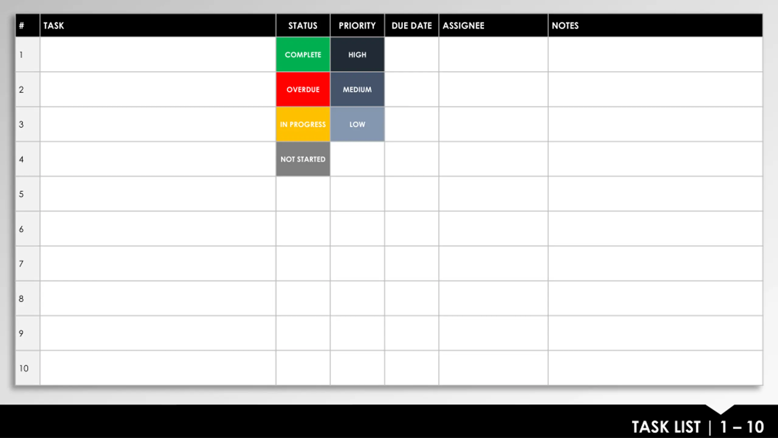 # TASK STATUS PRIORITY DUE DATE ASSIGNEE NOTES 1 COMPLETE HIGH 2 OVERDUE MEDIUM 3 IN PROGRESS LOW 4 NOT STARTED 5 6 7 8 9 10 TASK LIST | 1 10