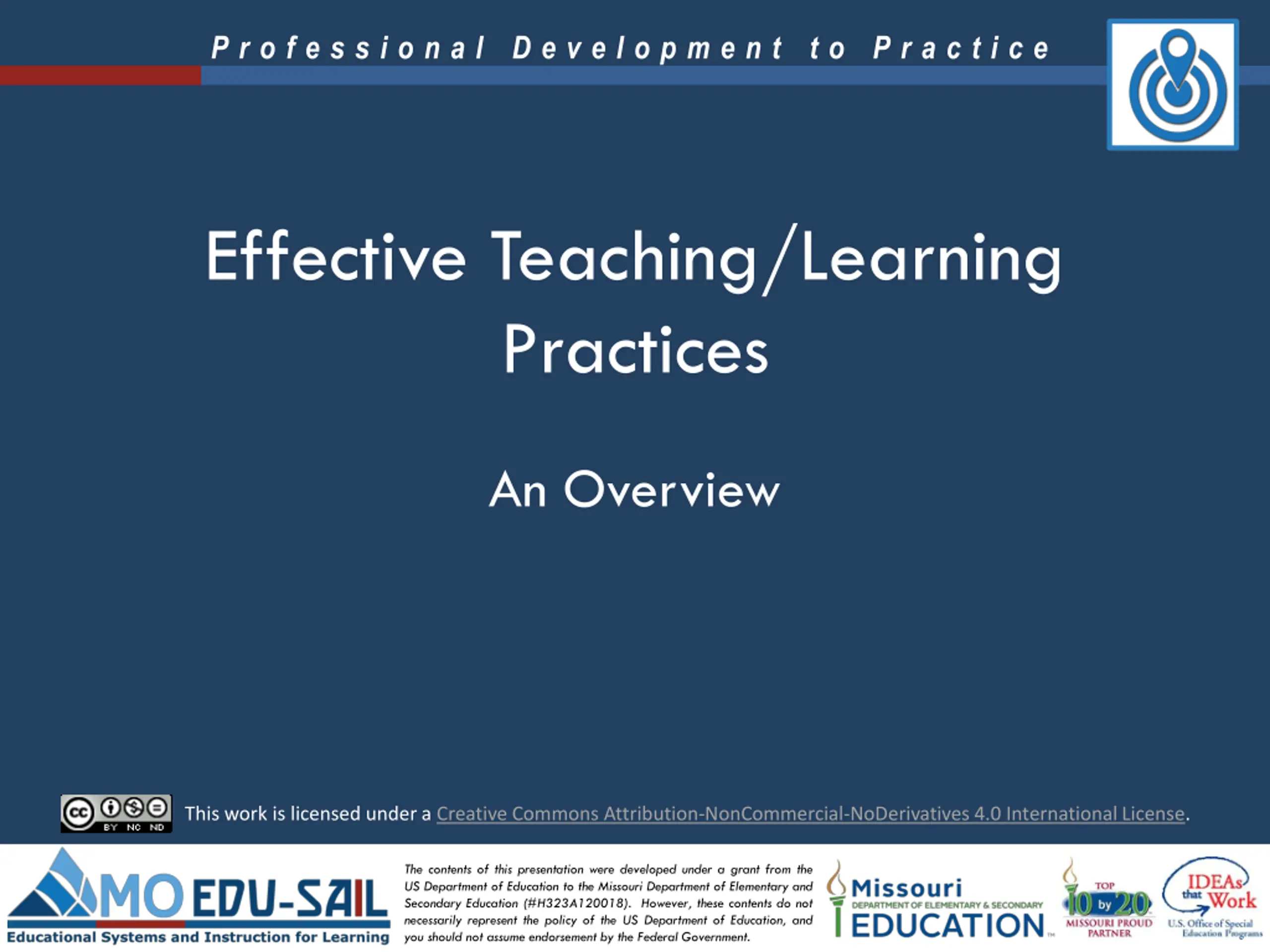 P r o f e s s i o n a l D e v e l o p m e n t t o P r a c t i c e P r o f e s s i o n a l D e v e l o p m e n t t o P r a c t i c e Effective Teaching/Learning Practices An Overview This work is licensed under a Creative Commons Attribution-NonCommercial-NoDerivatives 4.0 International License. The contents of this presentation were developed under a grant from the US Department of Education to the Missouri Department of Elementary and Secondary Education (#H323A120018). However, these contents do not necessarily represent the policy of the US Department of Education, and you should not assume endorsement by the Federal Government.