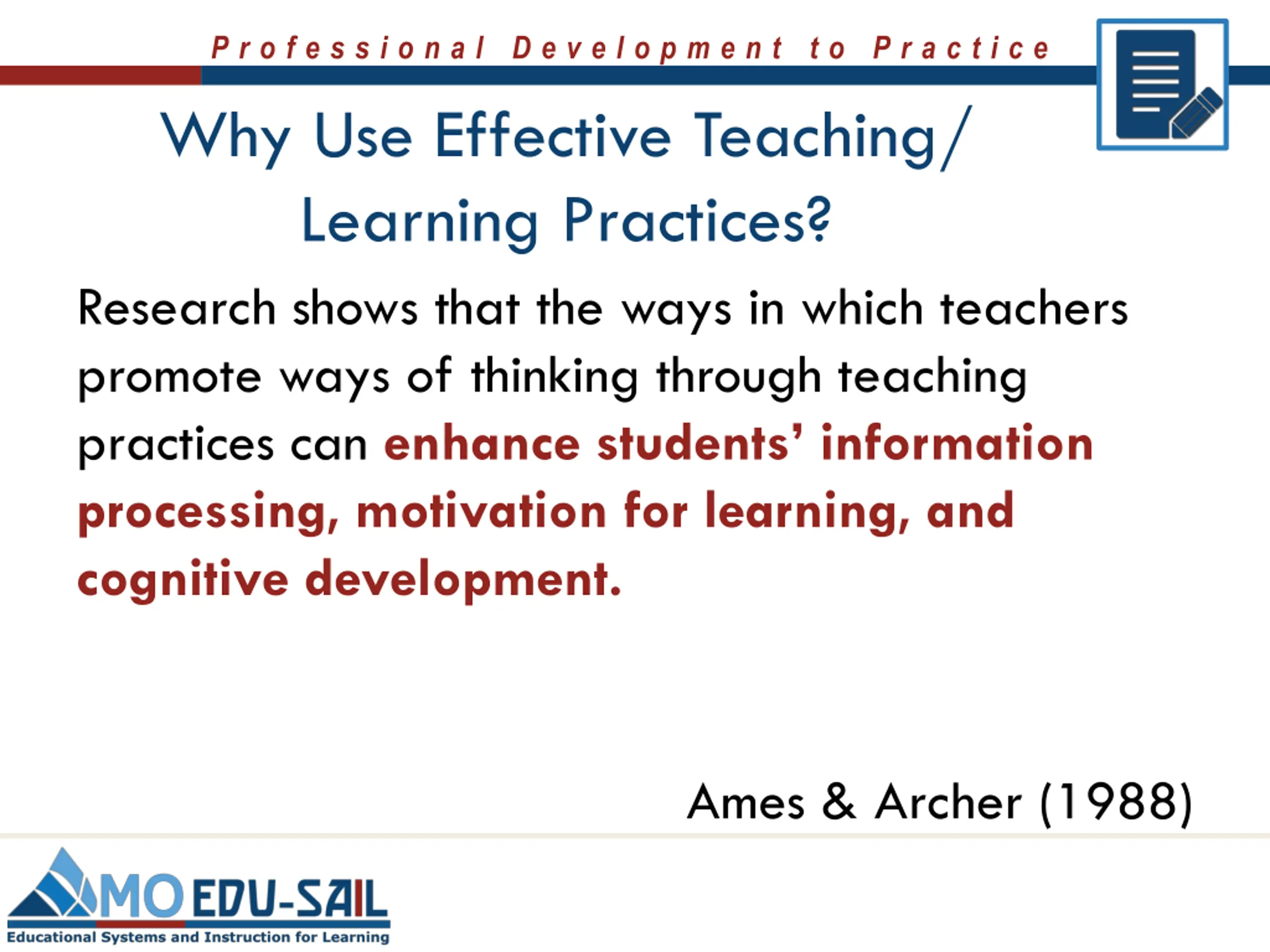 P r o f e s s i o n a l D e v e l o p m e n t t o P r a c t i c e Why Use Effective Teaching/ Learning Practices? Research shows that the ways in which teachers promote ways of thinking through teaching practices can enhance students information processing, motivation for learning, and cognitive development. Ames & Archer (1988)