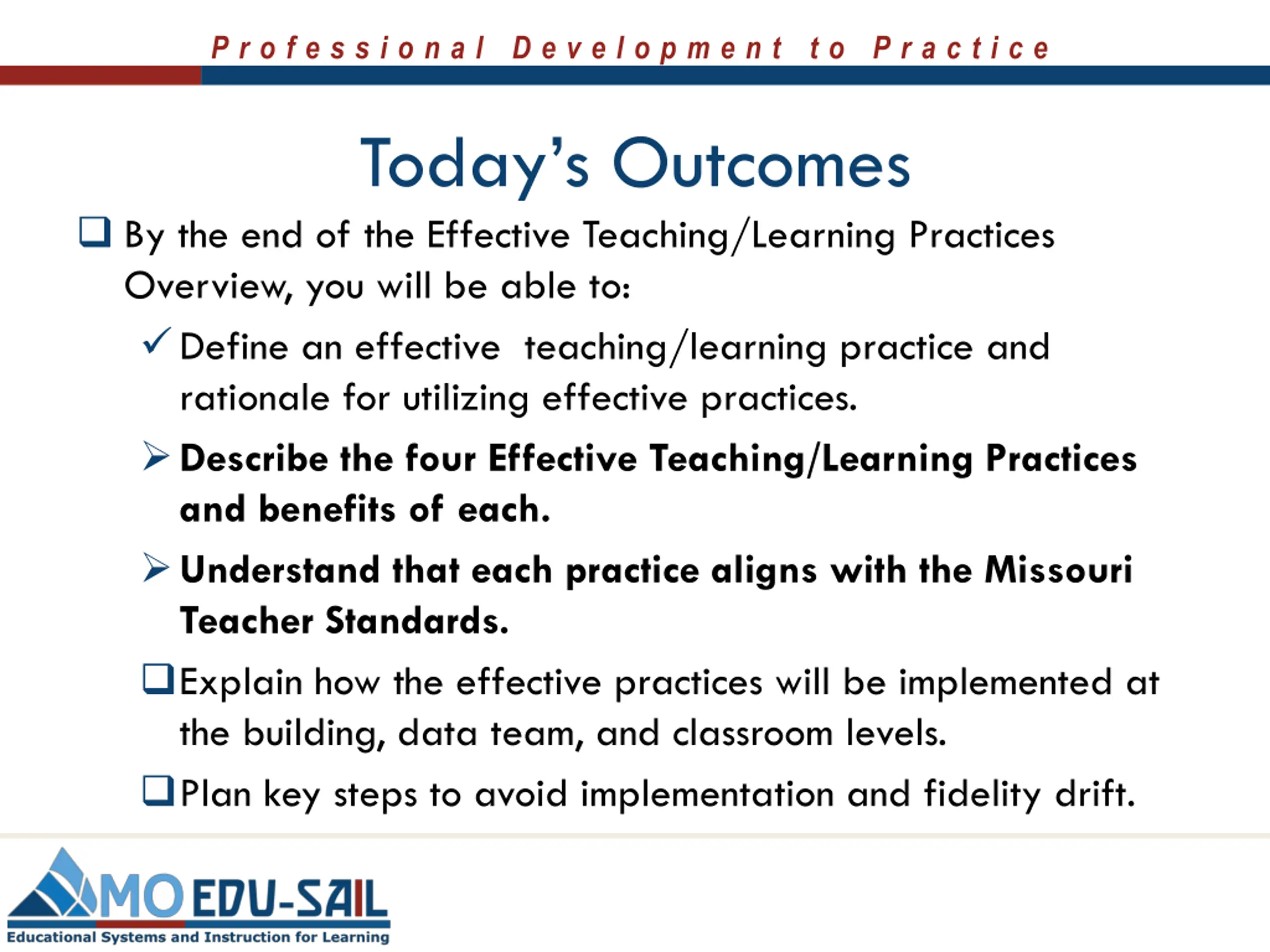 P r o f e s s i o n a l D e v e l o p m e n t t o P r a c t i c e Today s Outcomes By the end of the Effective Teaching/Learning Practices Overview, you will be able to: Define an effective teaching/learning practice and rationale for utilizing effective practices. Describe four Effective Teaching/Learning Practices and benefits of each. Understand that each practice aligns with the Missouri Teacher Standards. Explain how the Effective Teaching/Learning Practices will be implemented at the building, data team, and classroom levels. Plan key steps to avoid implementation and fidelity drift.