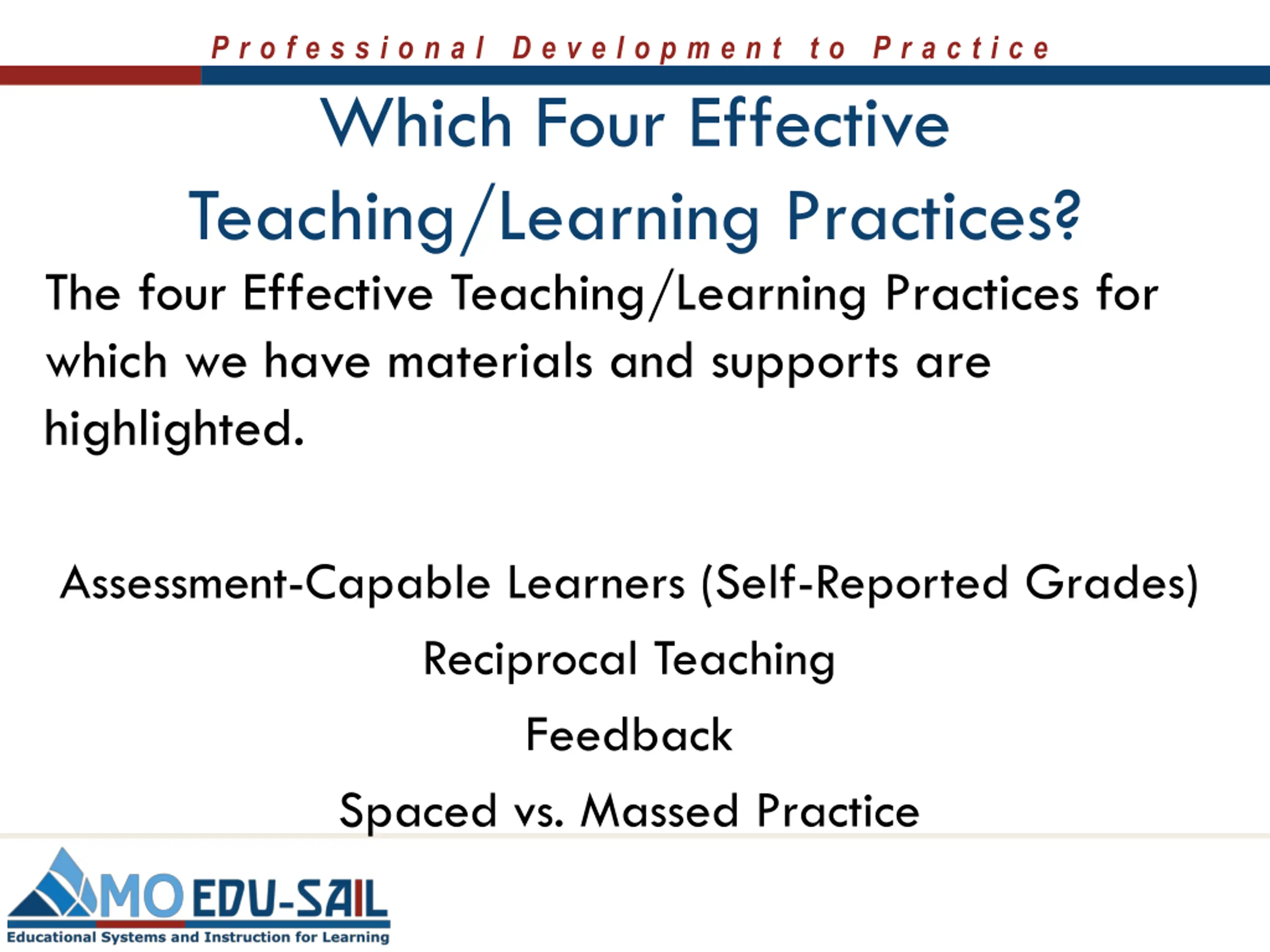 P r o f e s s i o n a l D e v e l o p m e n t t o P r a c t i c e Which Four Effective Teaching/Learning Practices? The four Effective Teaching/Learning Practices for which we have materials and supports are highlighted. Assessment-Capable Learners (Self-Reported Grades) Reciprocal Teaching Feedback Spaced vs. Massed Practice