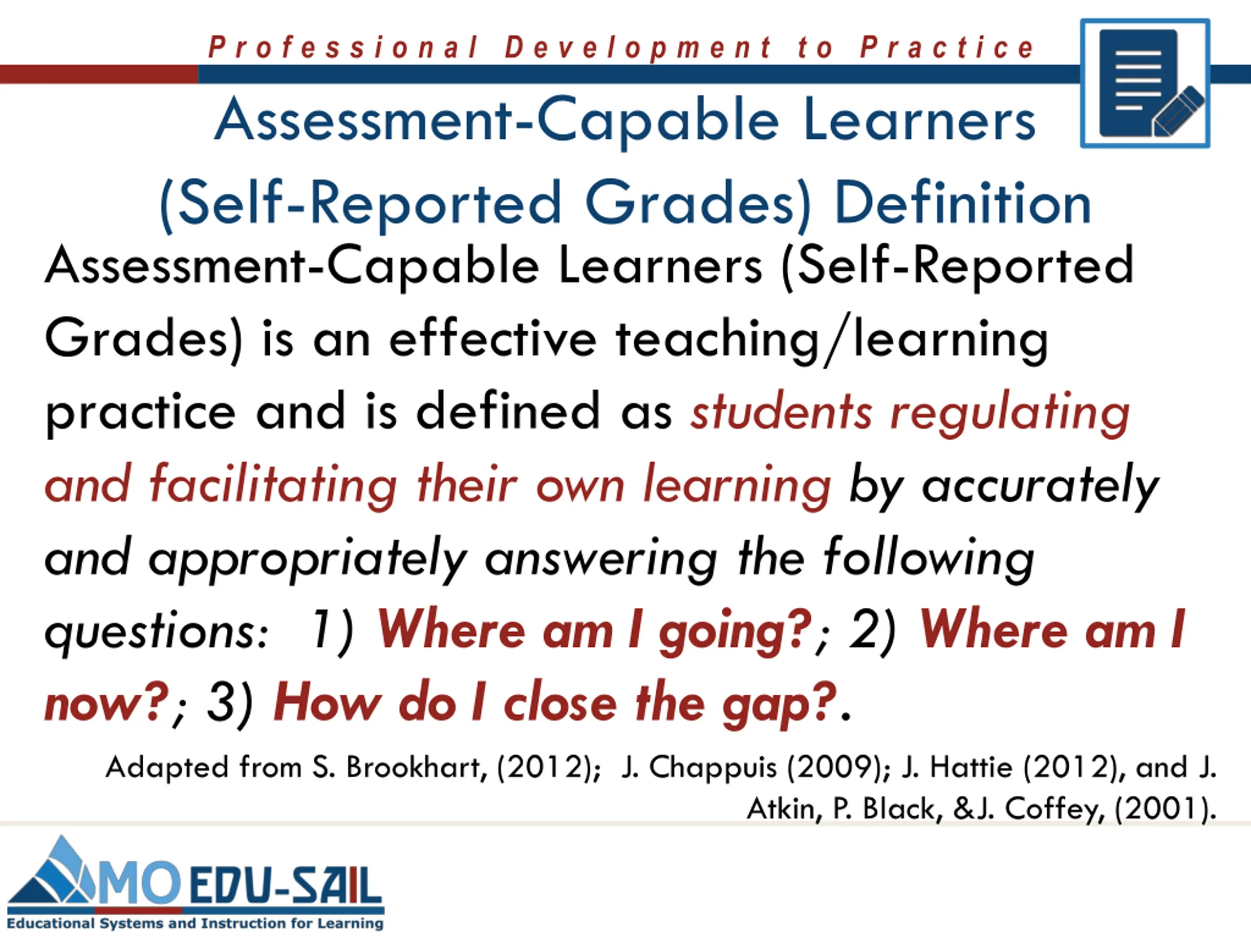 P r o f e s s i o n a l D e v e l o p m e n t t o P r a c t i c e Assessment-Capable Learners (Self-Reported Grades) Definition Assessment-Capable Learners (Self-Reported Grades) is an effective teaching/learning practice and is defined as students regulating and facilitating their own learningby accurately and appropriately answering the following questions: 1) Where am I going?; 2) Where am I now?; 3) How do I close the gap?. Adapted from S. Brookhart, (2012); J. Chappuis (2009); J. Hattie (2012), and J. Atkin, P. Black, &J. Coffey, (2001).