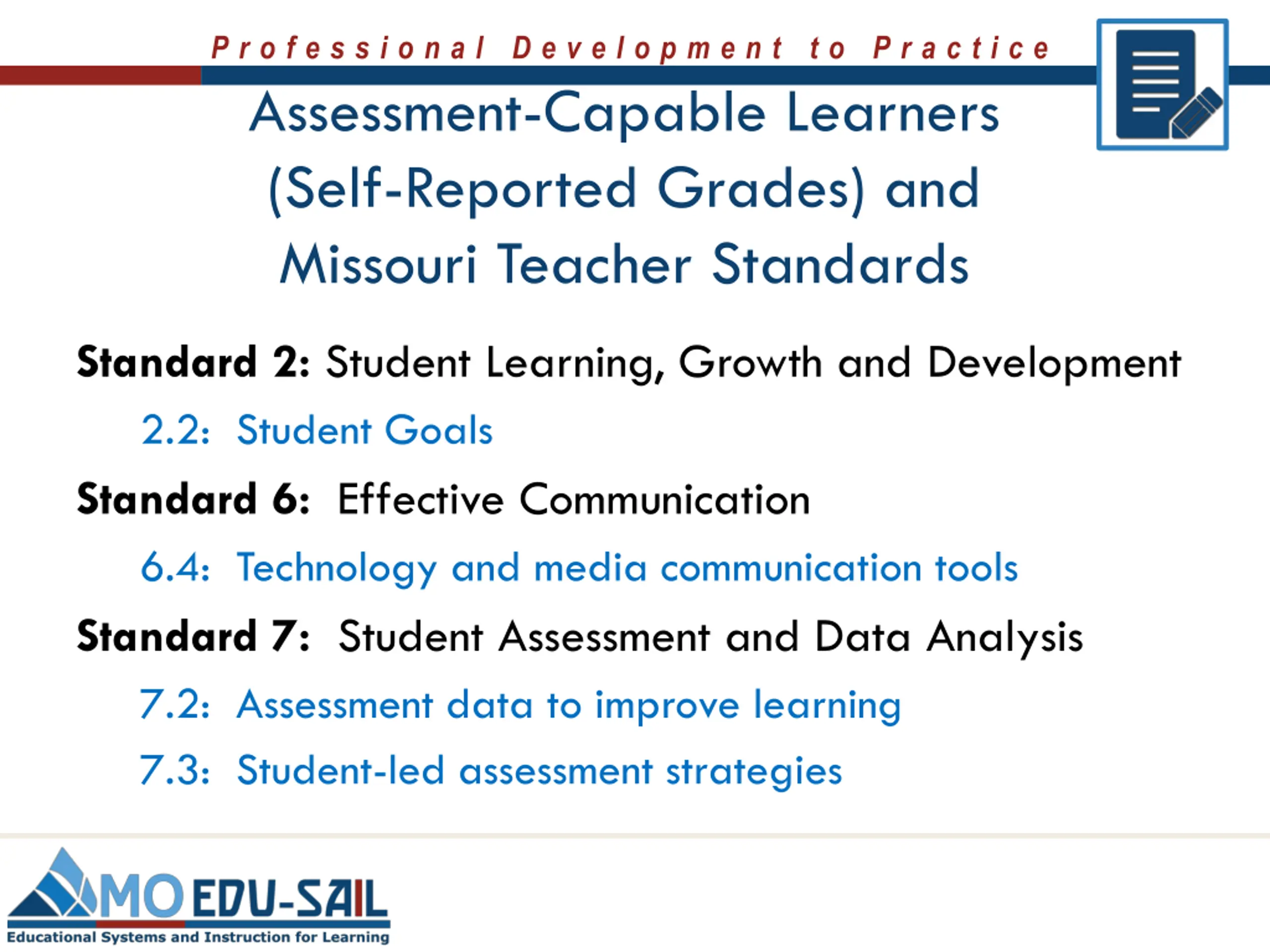 P r o f e s s i o n a l D e v e l o p m e n t t o P r a c t i c e Assessment-Capable Learners (Self-Reported Grades) and Missouri Teacher Standards Standard 2: Student Learning, Growth and Development 2.2: Student Goals Standard 6: Effective Communication 6.4: Technology and media communication tools Standard 7: Student Assessment and Data Analysis 7.2: Assessment data to improve learning 7.3: Student-led assessment strategies