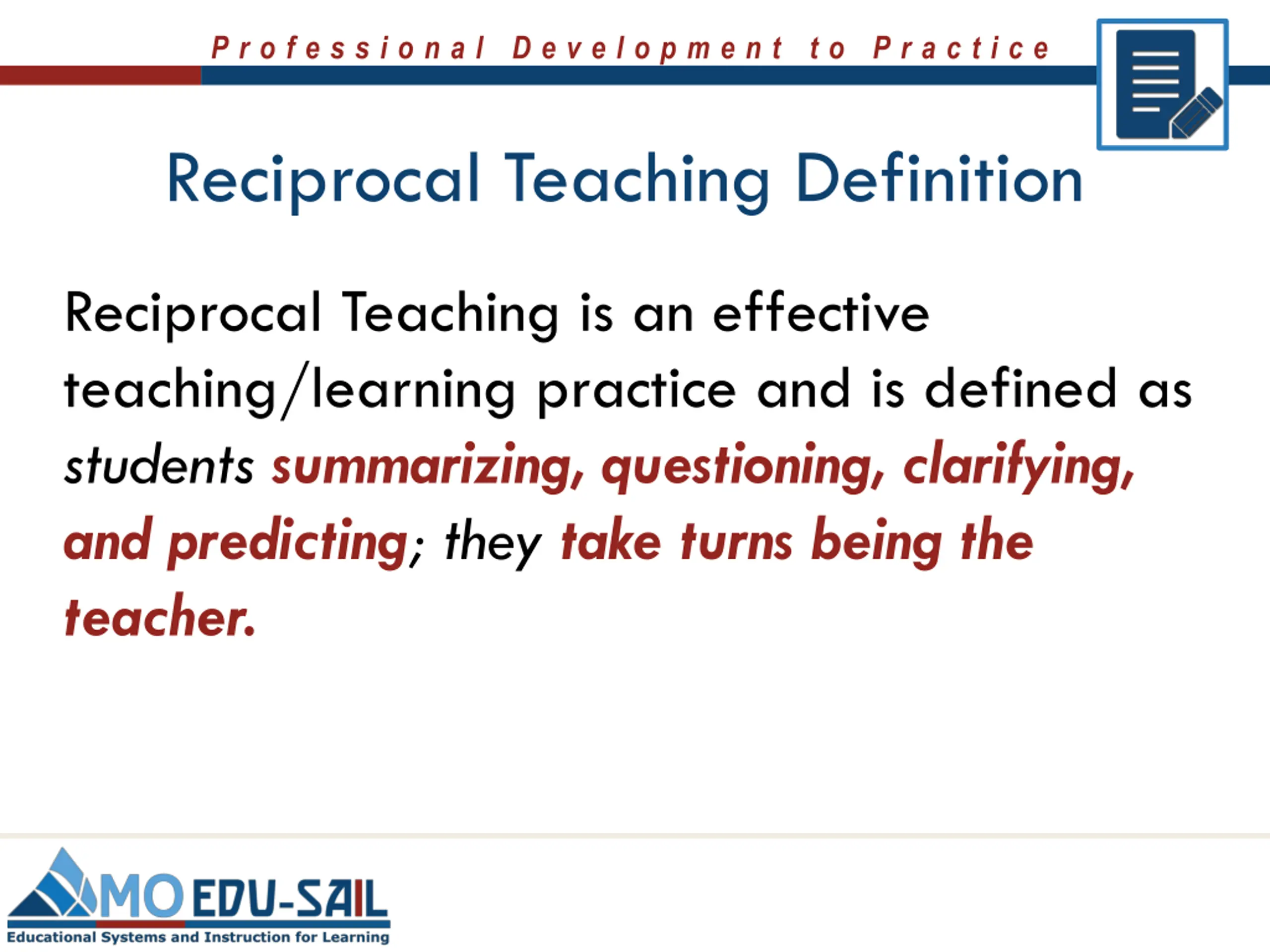 P r o f e s s i o n a l D e v e l o p m e n t t o P r a c t i c e Reciprocal Teaching Definition Reciprocal Teaching is an effective teaching/learning practice and is defined as students summarizing, questioning, clarifying, and predicting; they take turns being the teacher.
