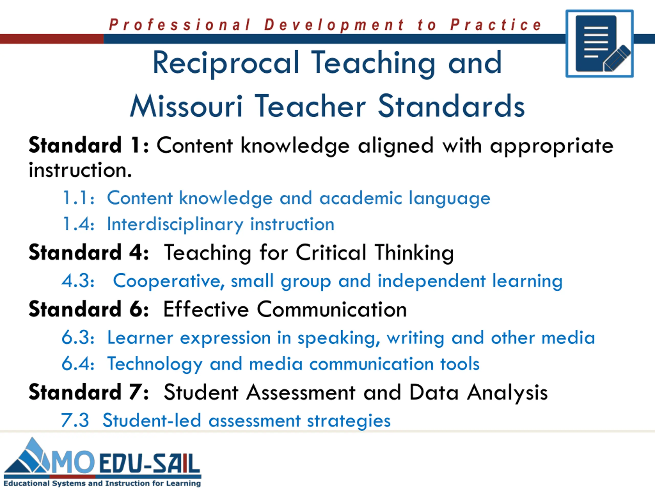 P r o f e s s i o n a l D e v e l o p m e n t t o P r a c t i c e Reciprocal Teaching and Missouri Teacher Standards Standard 1: Content knowledge aligned with appropriate instruction. 1.1: Content knowledge and academic language 1.4: Interdisciplinary instruction Standard 4: Teaching for Critical Thinking 4.3: Cooperative, small group and independent learning Standard 6: Effective Communication 6.3: Learner expression in speaking, writing and other media 6.4: Technology and media communication tools Standard 7: Student Assessment and Data Analysis 7.3 Student-led assessment strategies