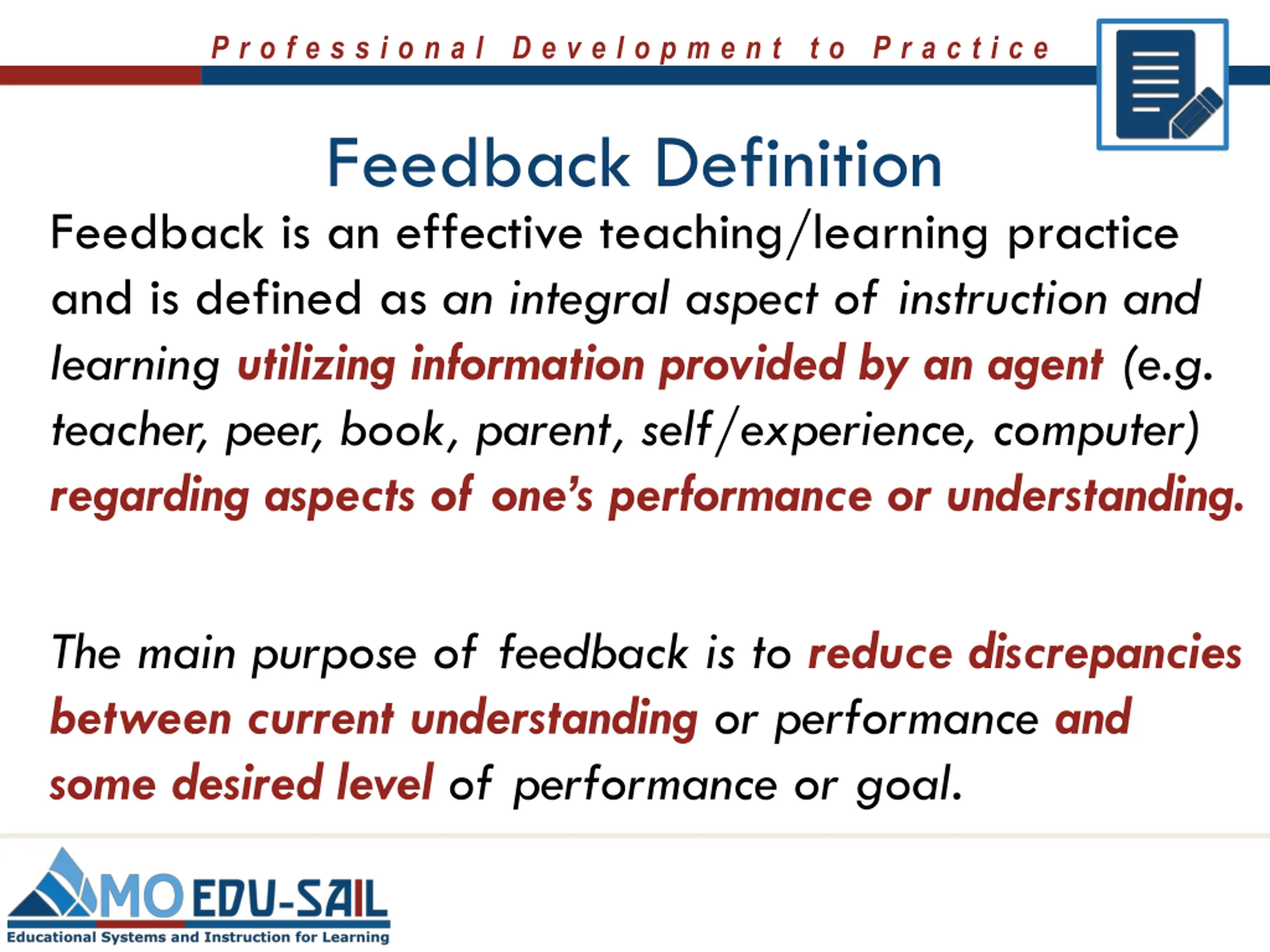 P r o f e s s i o n a l D e v e l o p m e n t t o P r a c t i c e Feedback Definition Feedback is an effective teaching/learning practice and is defined as an integral aspect of instruction and learning utilizing information provided by an agent (e.g. teacher, peer, book, parent, self/experience, computer) regarding aspects of one s performance or understanding. The main purpose of feedback is to reduce discrepancies between current understanding or performance and some desired level of performance or goal.