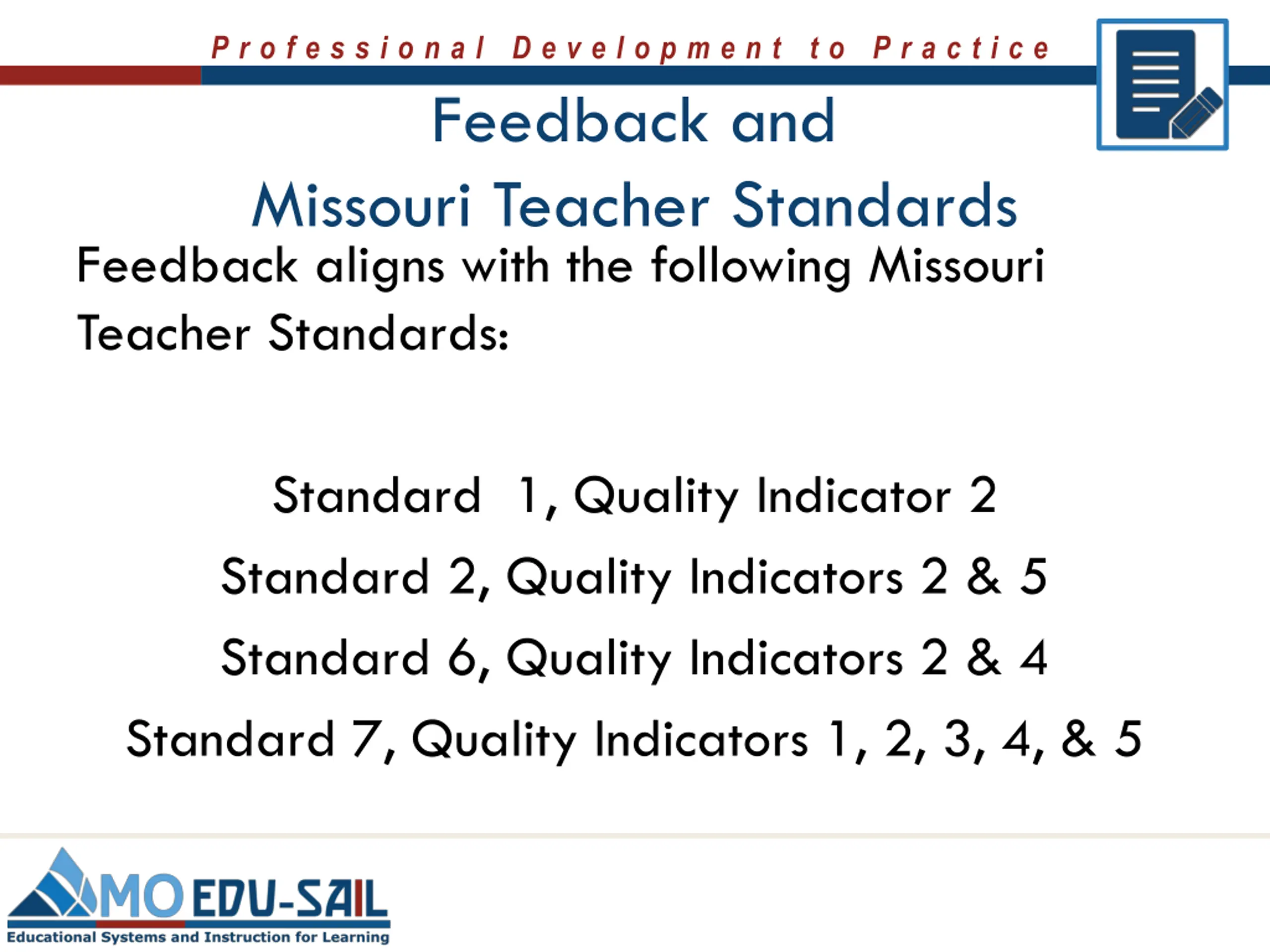 P r o f e s s i o n a l D e v e l o p m e n t t o P r a c t i c e Feedback and Missouri Teacher Standards Feedback aligns with the following Missouri Teacher Standards: Standard 1, Quality Indicator 2 Standard 2, Quality Indicators 2 & 5 Standard 6, Quality Indicators 2 & 4 Standard 7, Quality Indicators 1, 2, 3, 4, & 5