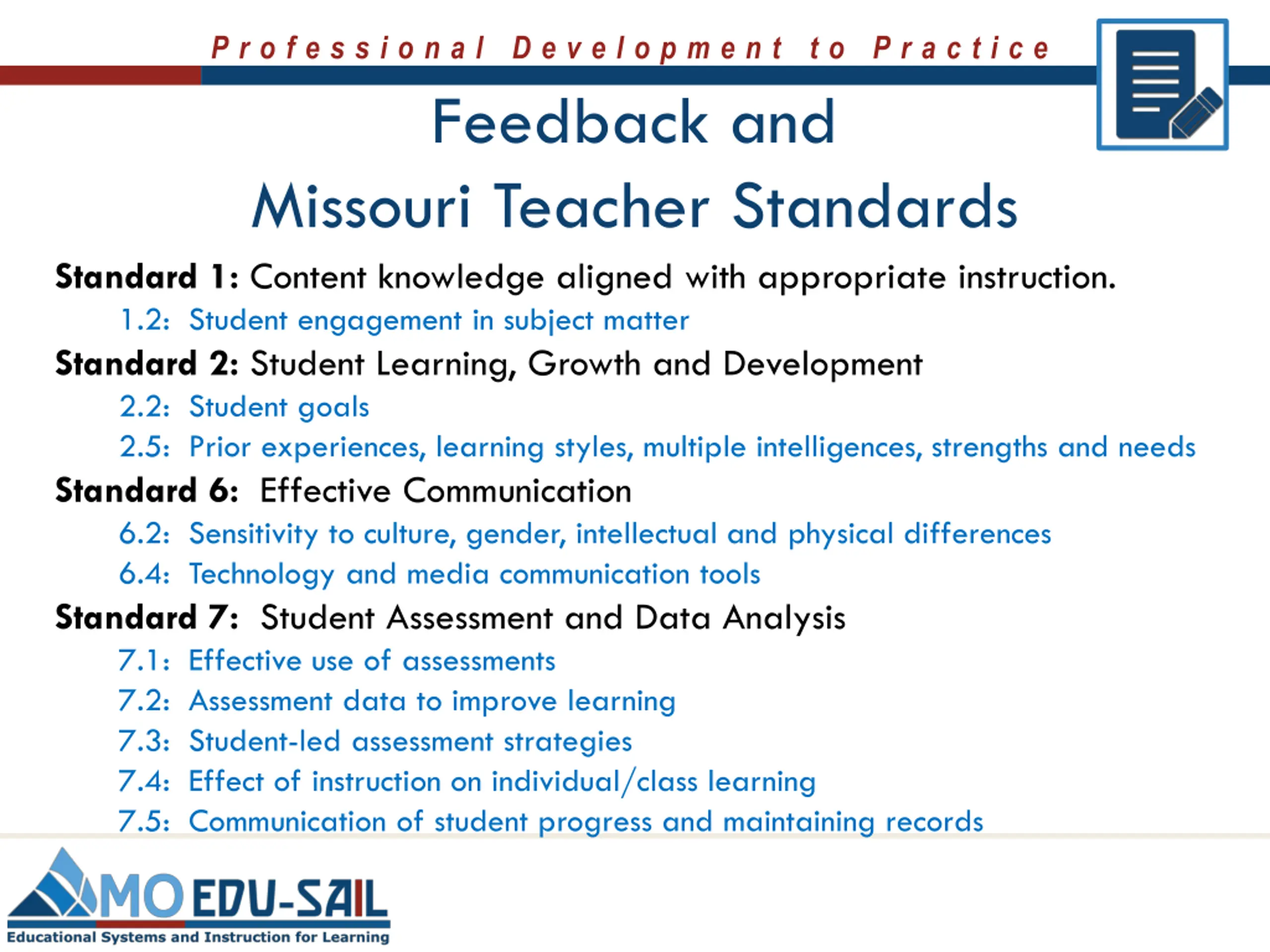 P r o f e s s i o n a l D e v e l o p m e n t t o P r a c t i c e Feedback and Missouri Teacher Standards Standard 1: Content knowledge aligned with appropriate instruction. 1.2: Student engagement in subject matter Standard 2: Student Learning, Growth and Development 2.2: Student goals 2.5: Prior experiences, learning styles, multiple intelligences, strengths and needs Standard 6: Effective Communication 6.2: Sensitivity to culture, gender, intellectual and physical differences 6.4: Technology and media communication tools Standard 7: Student Assessment and Data Analysis 7.1: Effective use of assessments 7.2: Assessment data to improve learning 7.3: Student-led assessment strategies 7.4: Effect of instruction on individual/class learning 7.5: Communication of student progress and maintaining records