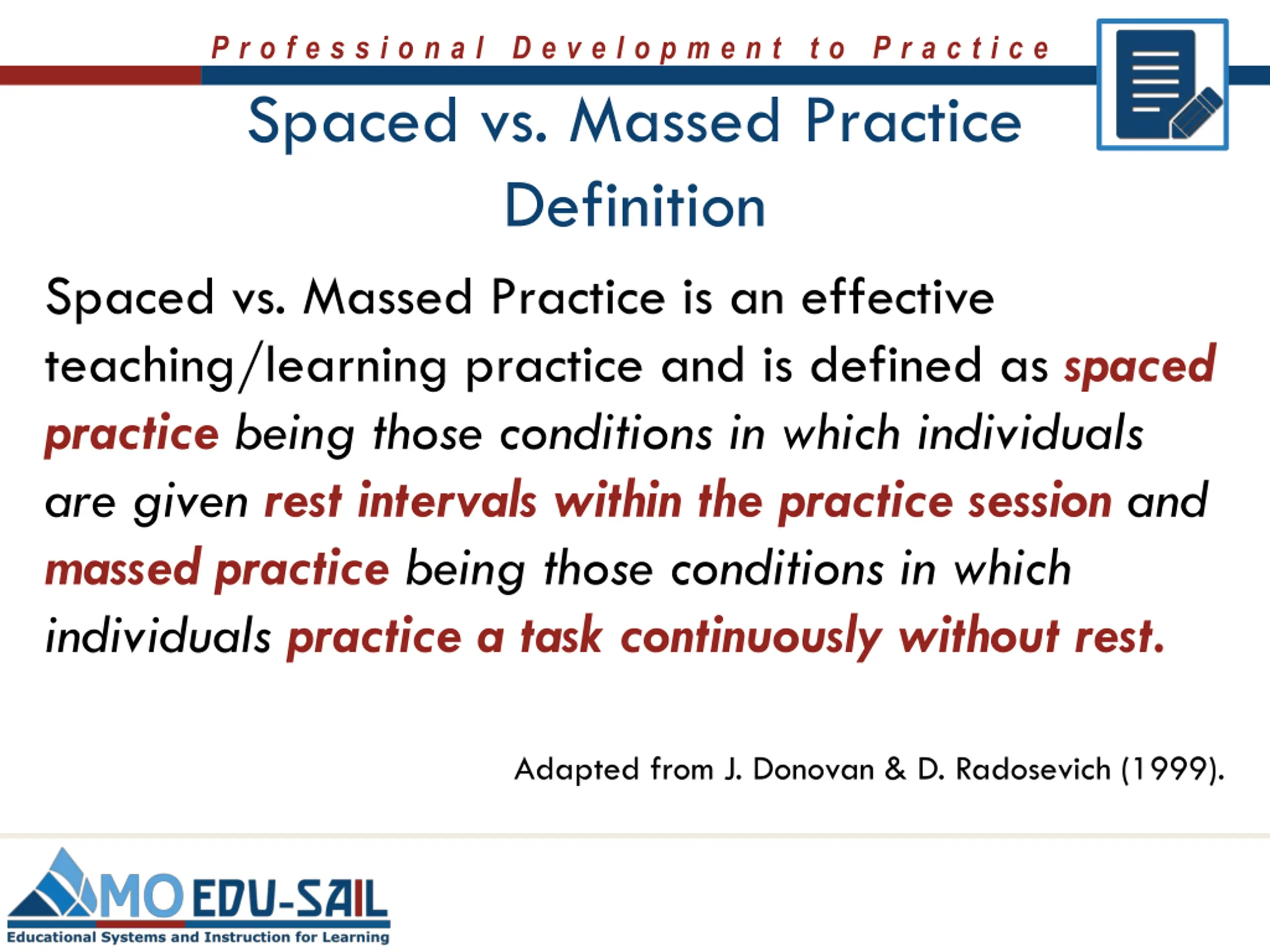 P r o f e s s i o n a l D e v e l o p m e n t t o P r a c t i c e Spaced vs. Massed Practice Definition Spaced vs. Massed Practice is an effective teaching/learning practice and is defined as spaced practice being those conditions in which individuals are given rest intervals within the practice session and massed practice being those conditions in which individuals practice a task continuously without rest. Adapted from J. Donovan & D. Radosevich (1999).