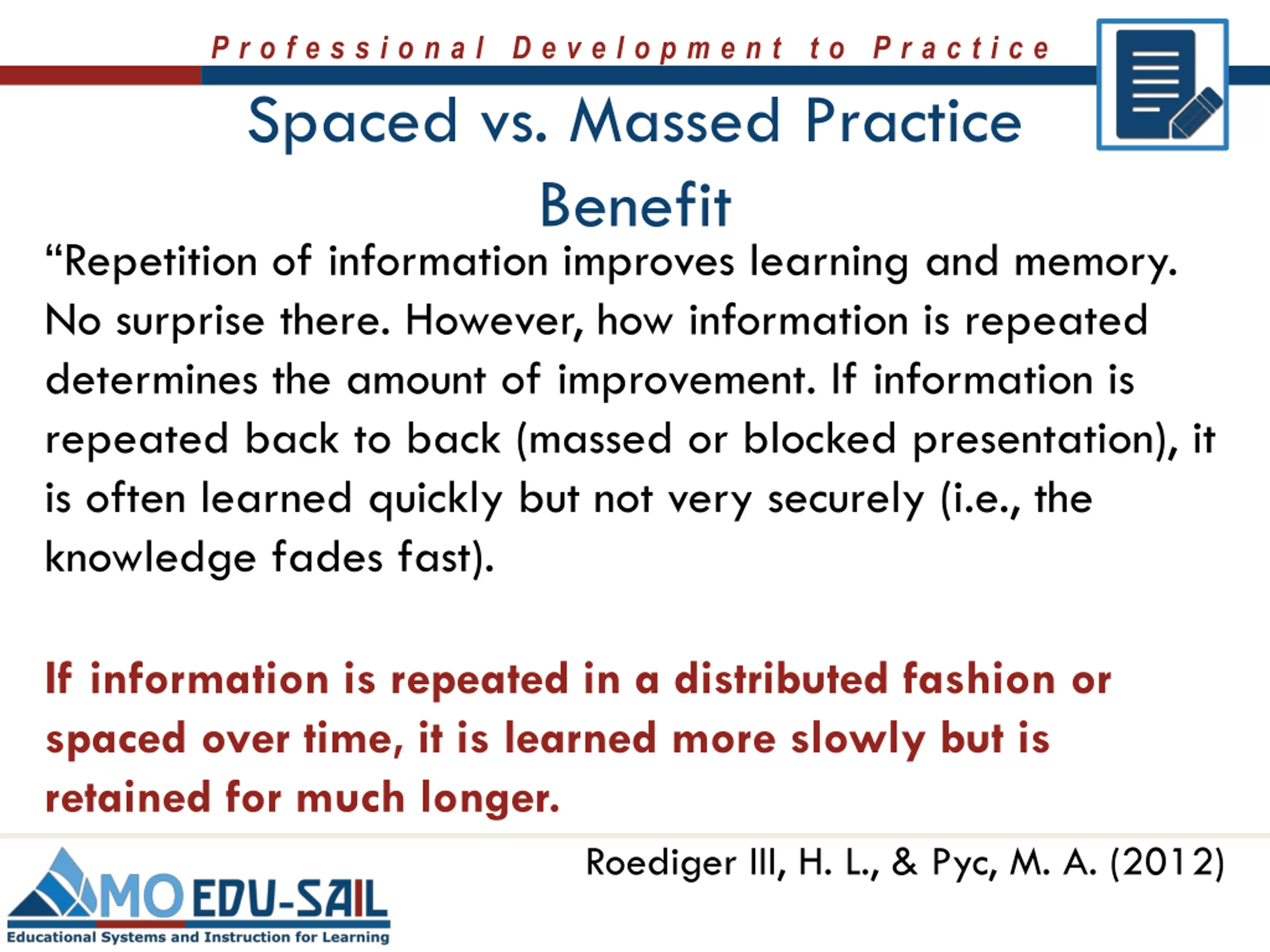 P r o f e s s i o n a l D e v e l o p m e n t t o P r a c t i c e Spaced vs. Massed Practice Benefit Repetition of information improves learning and memory. No surprise there. However, how information is repeated determines the amount of improvement. If information is repeated back to back (massed or blocked presentation), it is often learned quickly but not very securely (i.e., the knowledge fades fast). If information is repeated in a distributed fashion or spaced over time, it is learned more slowly but is retained for much longer. Roediger III, H. L., & Pyc, M. A. (2012)