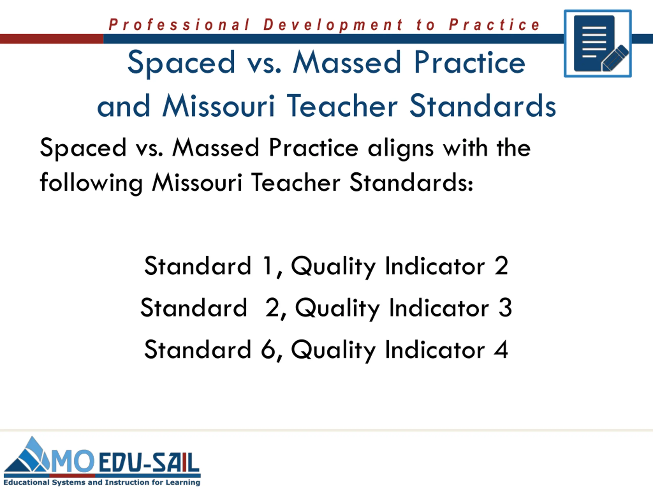 P r o f e s s i o n a l D e v e l o p m e n t t o P r a c t i c e Spaced vs. Massed Practice and Missouri Teacher Standards Spaced vs. Massed Practice aligns with the following Missouri Teacher Standards: Standard 1, Quality Indicator 2 Standard 2, Quality Indicator 3 Standard 6, Quality Indicator 4