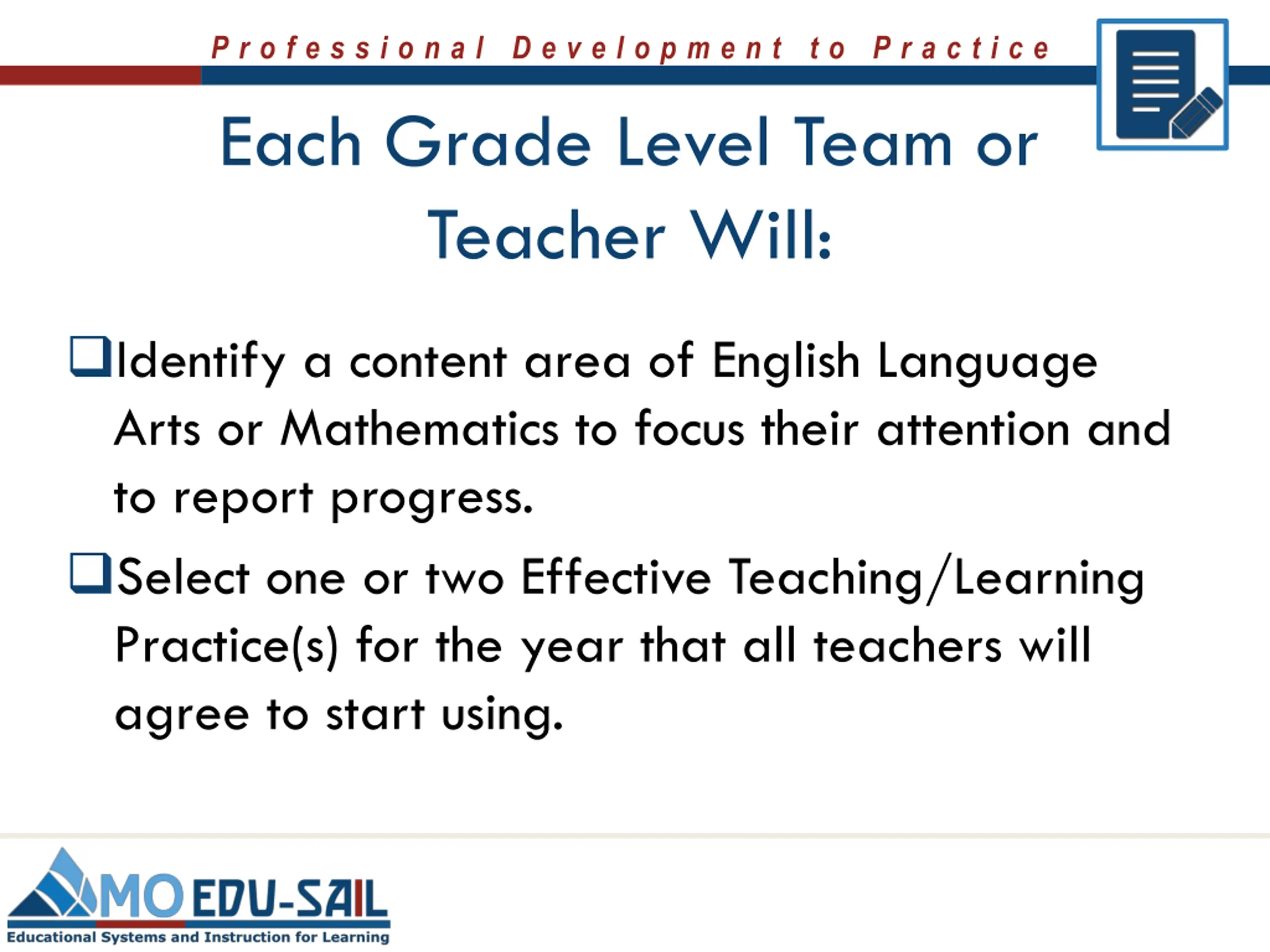 P r o f e s s i o n a l D e v e l o p m e n t t o P r a c t i c e Each Grade Level Team or Teacher Will: Identify a content area of English Language Arts or Mathematics to focus their attention and to report progress. Select one or two Effective Teaching/Learning Practice(s) for the year that all teachers will agree to start using.